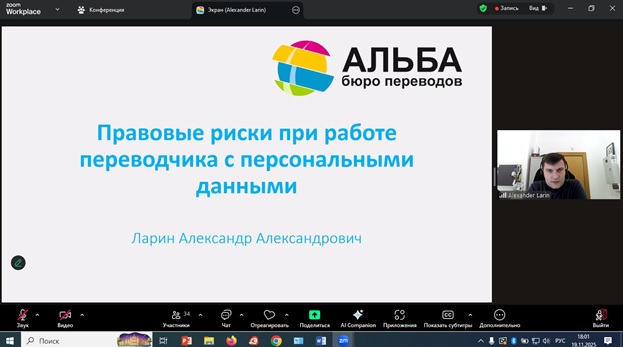 19 ноября 2025 г. состоялся вебинар «Правовые риски при работе переводчика с персональными данными», организованный Союзом переводчиков России. Целью вебинара было сформировать у представителей отрасли понимание того, как работать с персональными данными с учетом изменений, вступивших в силу 1 сентября 2025 года.
