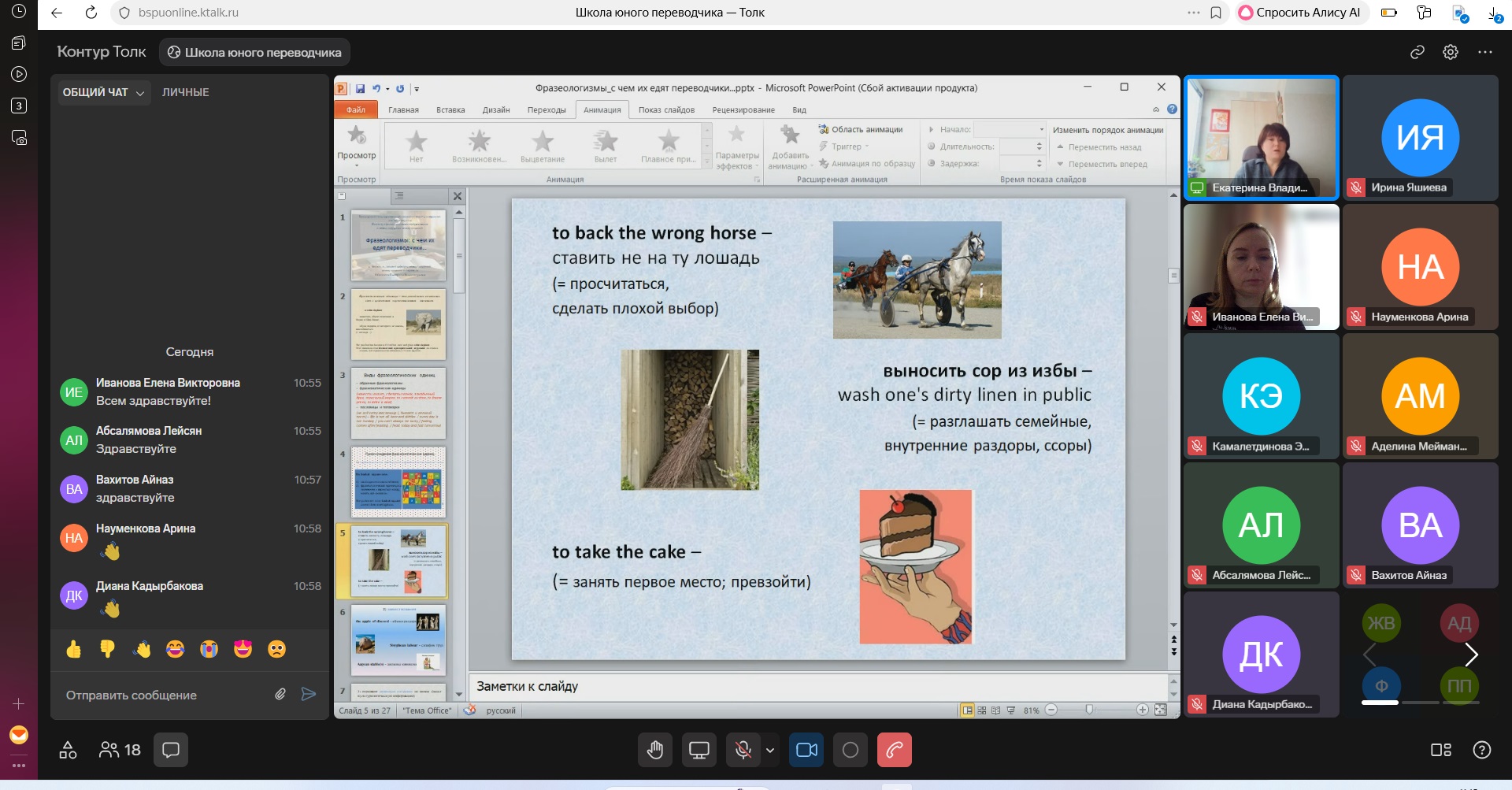 Были рассмотрены вопросы, связанные с определением фразеологических единиц, их видами, значением, а также происхождением. Основная часть лекции была посвящена вопросам перевода фразеологизмов, рассмотренных на примерах, взятых из художественных произведений, фильмов и мультфильмов, а также из нефтегазовой сферы. В конце занятия слушателям школы было предложено ответить на вопросы, связанные с темой лекции. Ребята принимали самое активное участие и поблагодарили Екатерину Владимировну за столь интересную подачу материала. В течение недели они, как обычно, будут выполнять задание по теме лекции, а насколько правильно им удалось его сделать, узнают к следующему занятию.