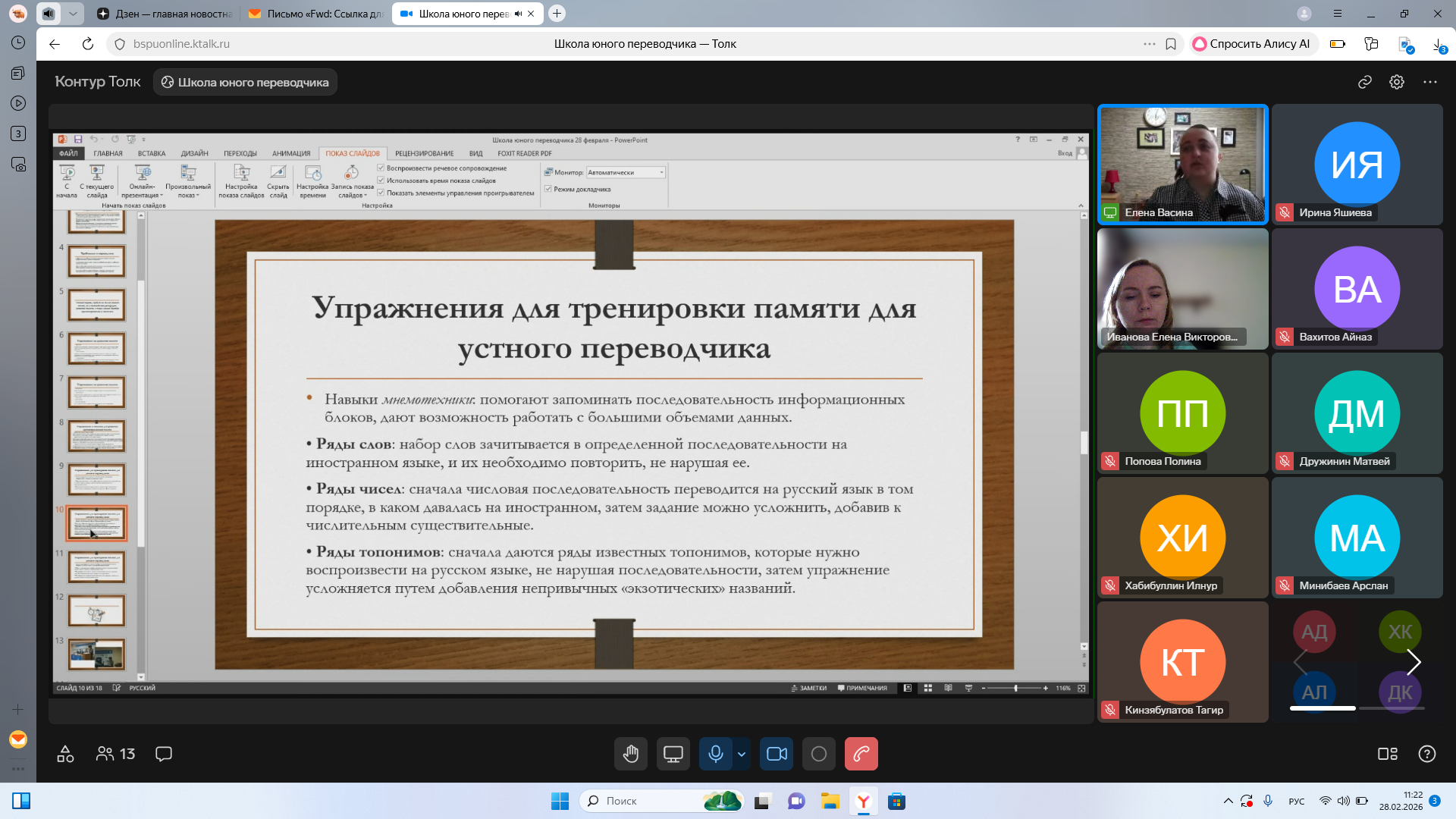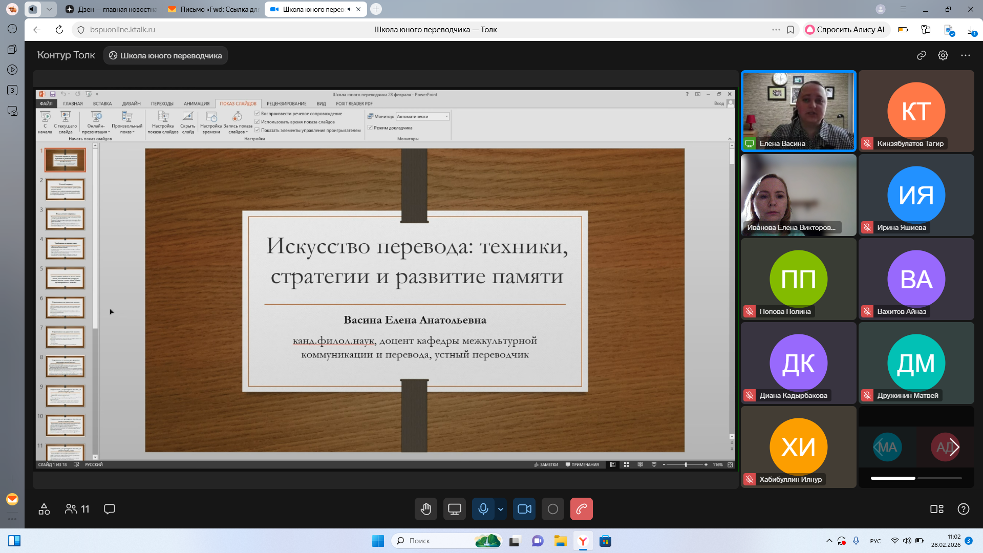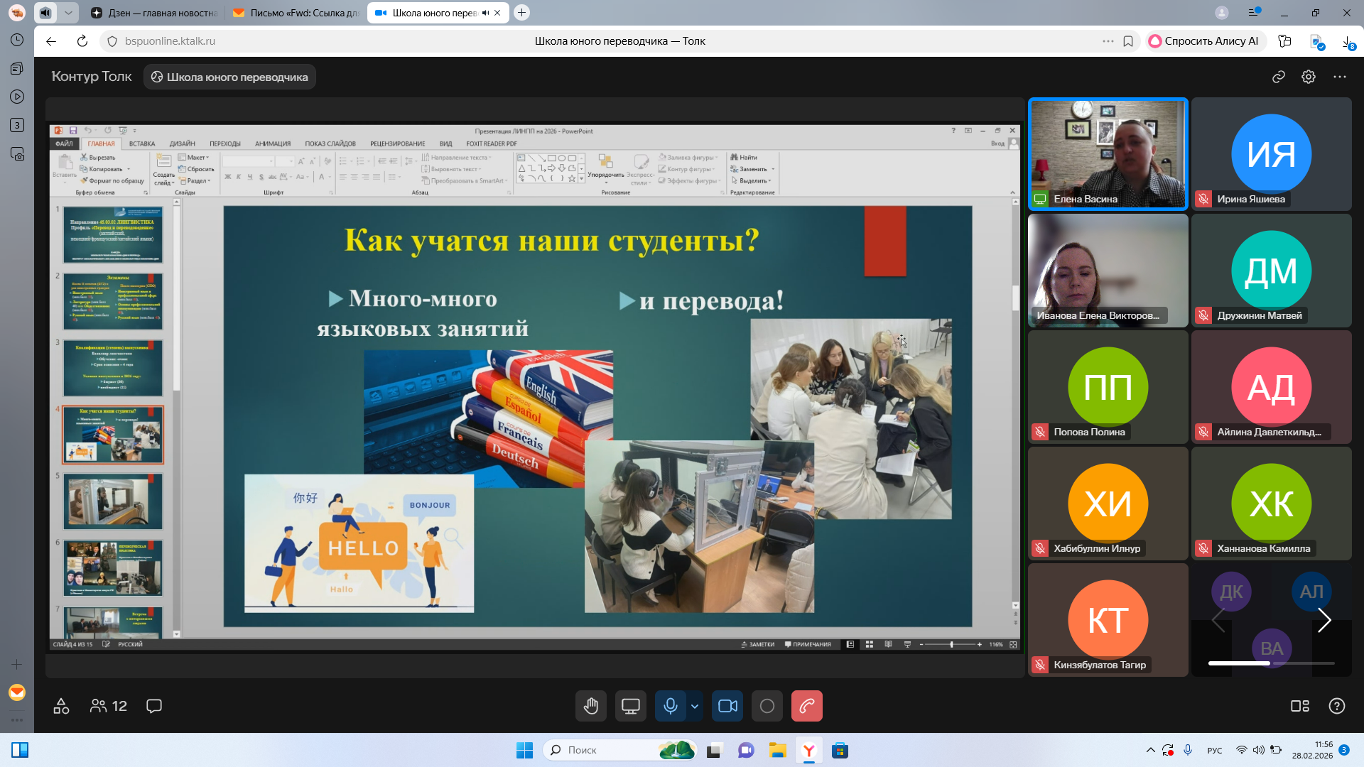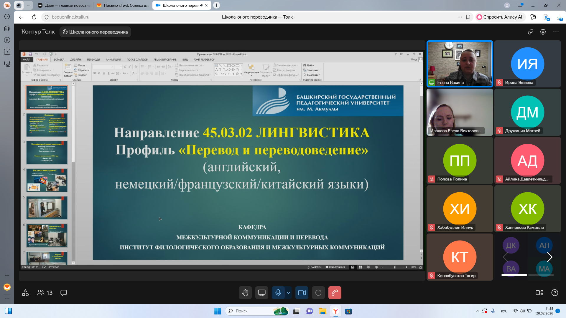 Сегодня, 28 февраля 2026 г., состоялось завершающее занятие на обучающем курсе «Школа юного переводчика», проводимом кафедрой межкультурной коммуникации и перевода Башкирского государственного педагогического университета им. М. Акмуллы для учащихся 10-11 классов общеобразовательных учреждений РФ с целью их профессионального ориентирования.