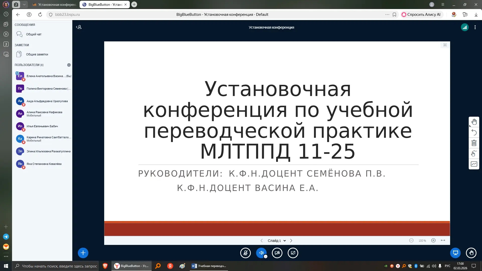 2 марта 2026 г. на кафедре межкультурной коммуникации состоялось онлайн-мероприятие для первокурсников направления 45.04.02 «Теория и практика переводческой деятельности» — установочная конференция по Учебной переводческой практике.