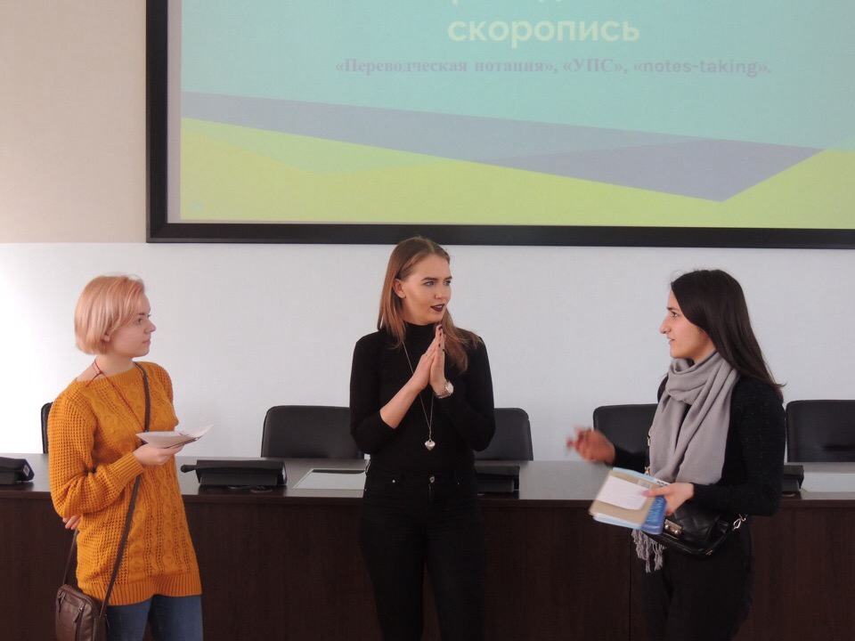 В рамках Дня открытых дверей университета студенты кафедры межкультурной коммуникации и перевода под руководством преподавателя Марфиной Ксении Сергеевны провели мастер-класс по основам переводческой деятельности.