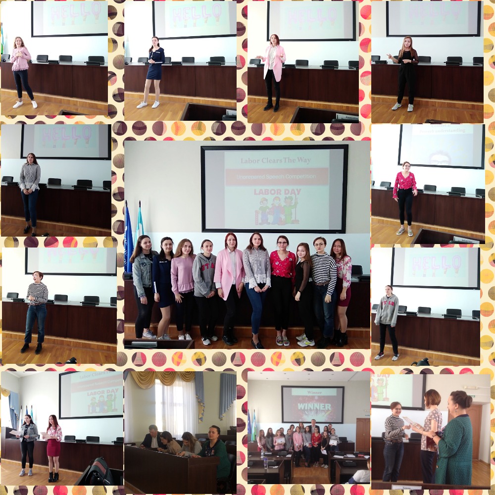 В рамках Практического курса первого иностранного языка (английский) студенты-лингвисты  2 курса приняли участие в конкурсе спонтанных выступлений. Им предстояло выполнить 3 задания и показать все свои знания и навыки устной речи. Тема конкурса была приурочена к Дню Труда.