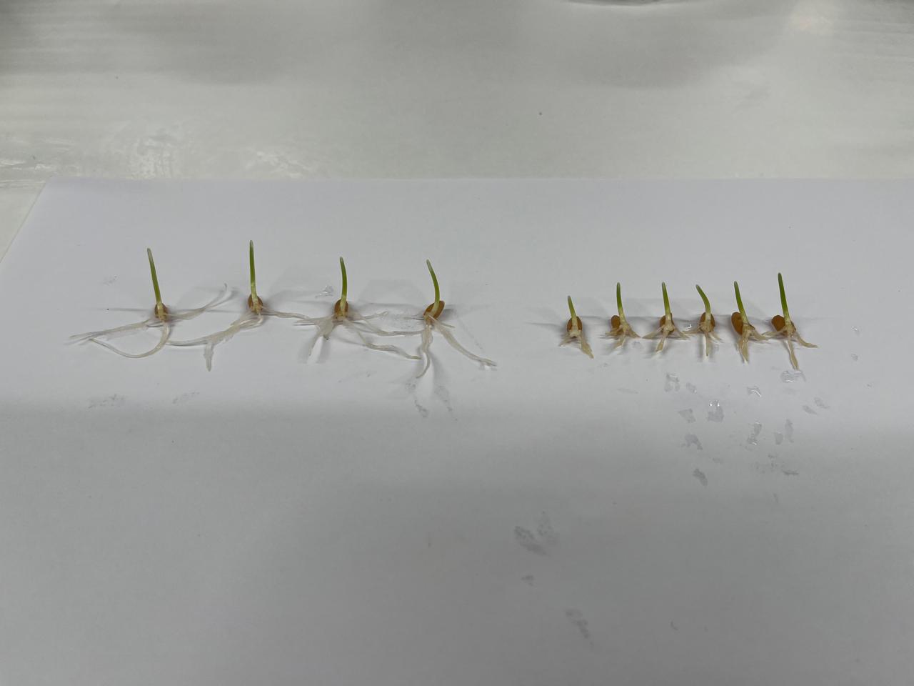 Описание для фото: Трёхдневные проростки пшеницы, выращенные на гидропонике. Слева — контрольная группа, справа — обработка ауксином.