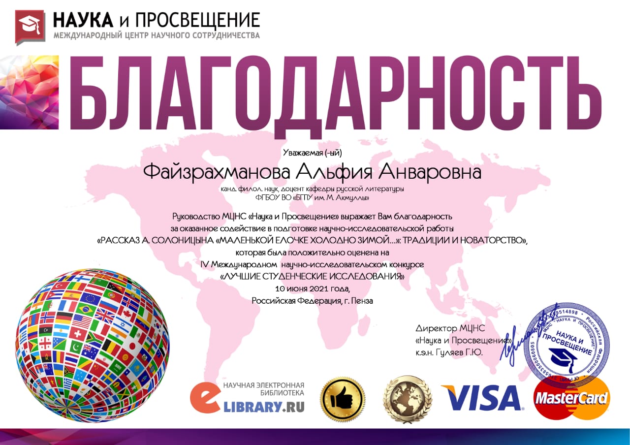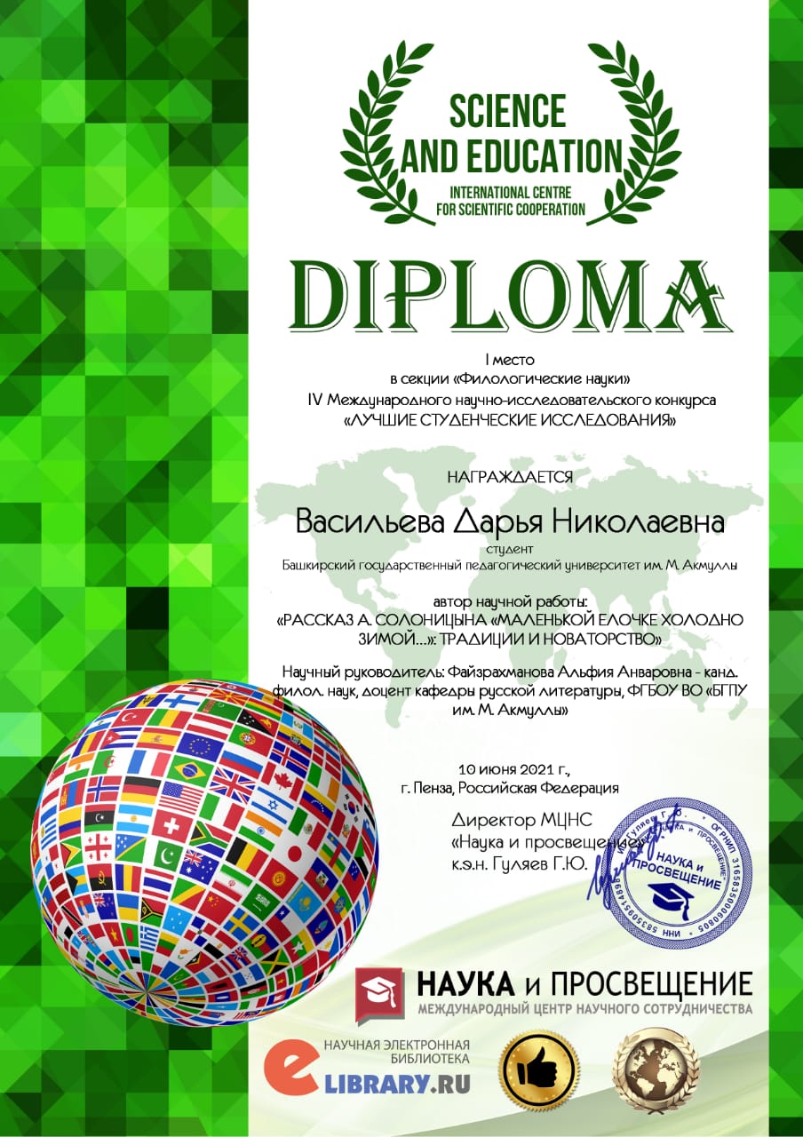 10 июня 2021 года состоялся IV Международный научно-исследовательский конкурс «Лучшие студенческие исследования». Это престижный конкурс, созданный с целью содействия эффективному развитию науки и инноваций. По итогам конкурса статьи победителей регистрируются и размещаются в научной электронной библиотеке ELIBRARY