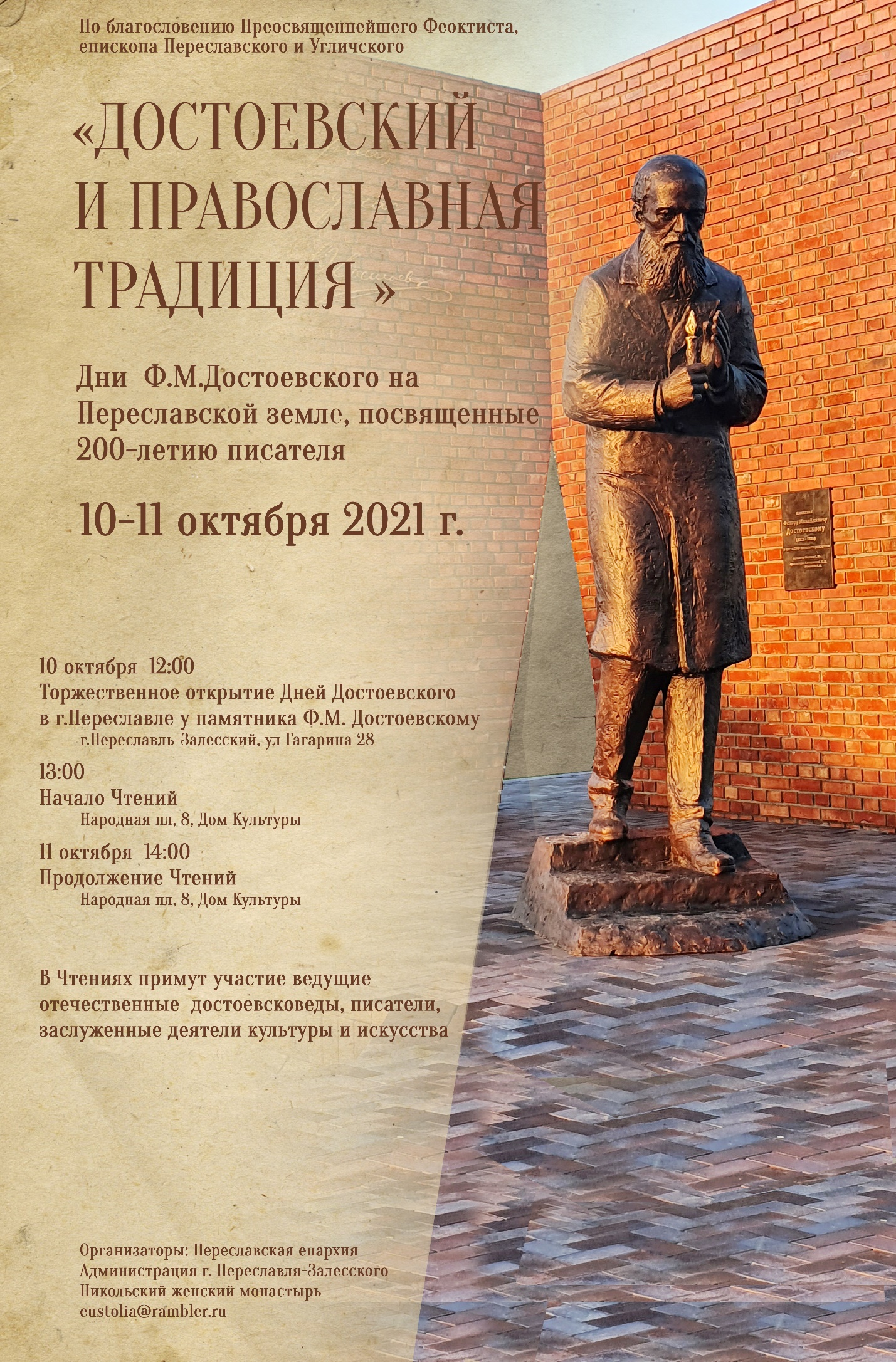 10-11 октября в г. Переславль-Залесский прошла другая Всероссийская конференция «Достоевский и православная традиция», в которой приняли участие видные ученые-достоевисты, писатели и священники русской православной церкви. Продуктивный диалог состоялся в Никольском женском монастыре. Участники конференции увидели новый памятник писателю, а также строящийся в селе Годеново грандиозный Софийский храм, который станет воплощением мечты Достоевского о том, что «Константинопль должен быть наш». Как сказал Почетный президент Международного общества Достоевского В.Н. Захаров, «София будет у нас». Профессор В.В. Борисова выступила с докладом «Куманины и Достоевский», подчеркнув, что родственники со стороны матери писателя купцы Куманины были родом из Переславля-Залесского.