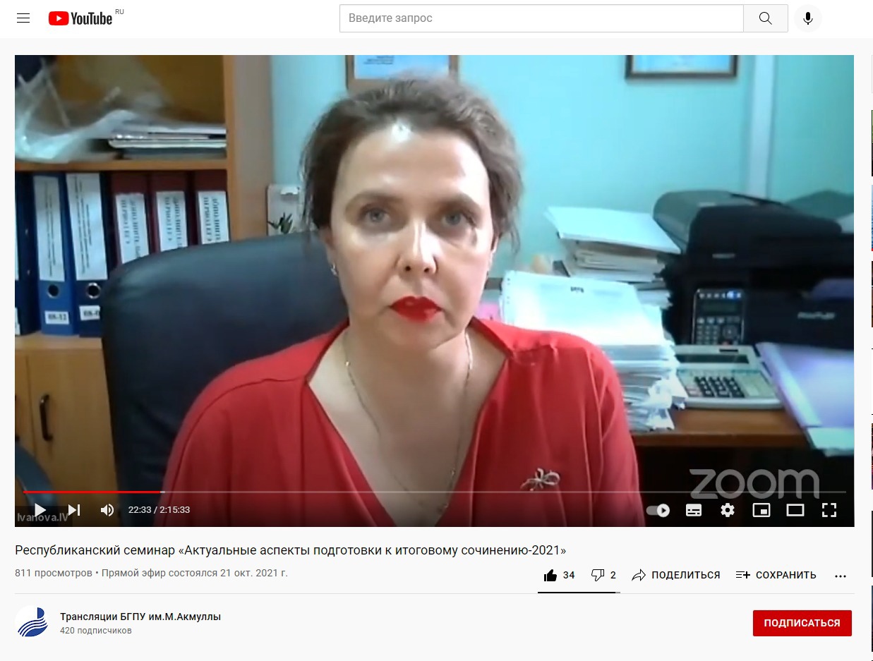 Центр подготовки к ГИА по русскому языку и литературе при ИФОМК БГПУ им. М. Акмуллы, созданный еще в 2009 году, продолжает осуществлять многогранную деятельность, в которую вовлечены преподаватели кафедр русской литературы и русского языка, теоретической и прикладной лингвистики. 21 октября Центр при содействии МО РБ провел масштабный республиканский вебинар для более чем 200 учителей-словесников «Актуальные аспекты подготовки к итоговому сочинению-2021». Модераторами вебинара выступили профессор В.В. Борисова и доцент Ю.А. Жукова, подробно прокомментировав все тематические направления. В арсенале учителей остались мультимедийные материалы и методические рекомендации. Организационную и техническую поддержку обеспечила методист Центра З.Р. Сайфутдинова.