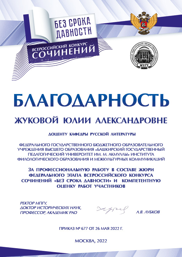 Федеральный оператор Всероссийского конкурса сочинений «Без срока давности» Московский педагогический государственный университет выразил благодарность доценту кафедры русской литературы Ю. А. Жуковой за активную работу в качестве члена жюри федерального этапа Всероссийского конкурса сочинений «Без срока давности».