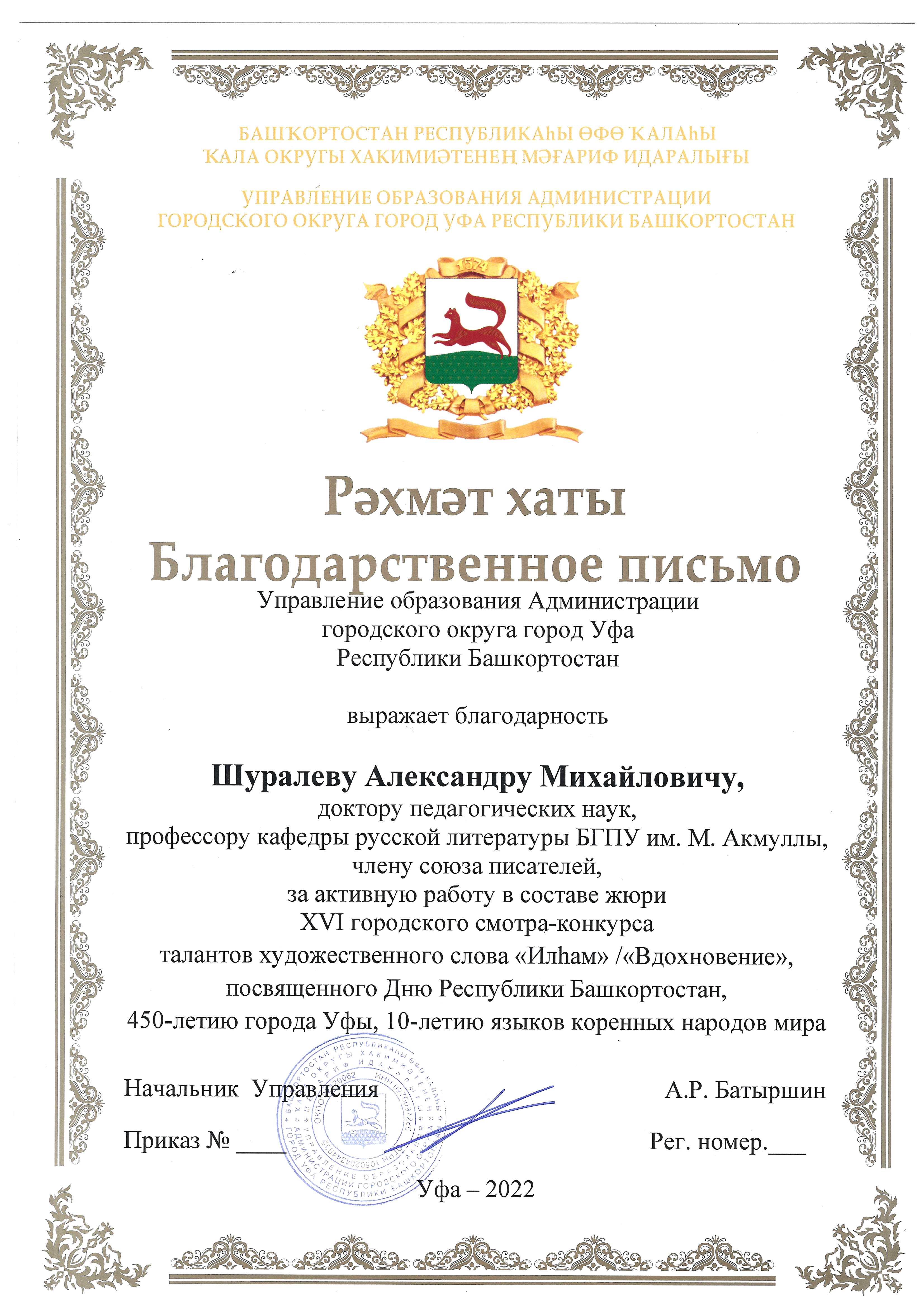 26 октября 2022 года на базе МБОУ Гимназия № 86 с углублённым изучением иностранных языков г. Уфы прошёл ХVI городской смотр-конкурс  художественного слова «Илһам»/«Вдохновение», посвящённый Дню Республики Башкортостан, 450-летию города Уфы.