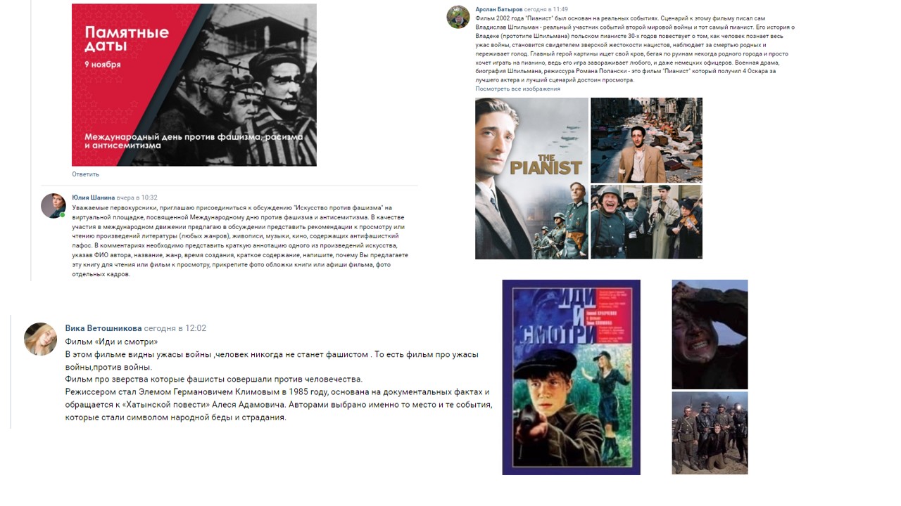 9 ноября 2022 г. во многих странах мира отмечается Международный день против фашизма и антисемитизма . В этот день мировое сообщество призывает почтить память погибших во время "Хрустальной ночи", а также всех жертв фашизма, и проинформировать людей об опасности национализма, популизма, антисемитизма, правого экстремизма и неофашизма. Студенты 1 курса направления подготовки Педагогическое образование, профиль "Русский язык и литература" присоединились к международной акции и приняли участие в обсуждении "Искусство против фашизма", которое было организовано заведующей кафедрой русской литературы Ю.А. Шаниной на виртуальной площадке социальной сети ВКонтакте. Первокурсники в виде комментариев представили рекомендации к просмотру или чтению произведения литературы, живописи, кино, содержащие антифашистский пафос. В сообщениях они поделились личными впечатлениями, сопроводили свои комментарии ссылками и иллюстративным материалом.