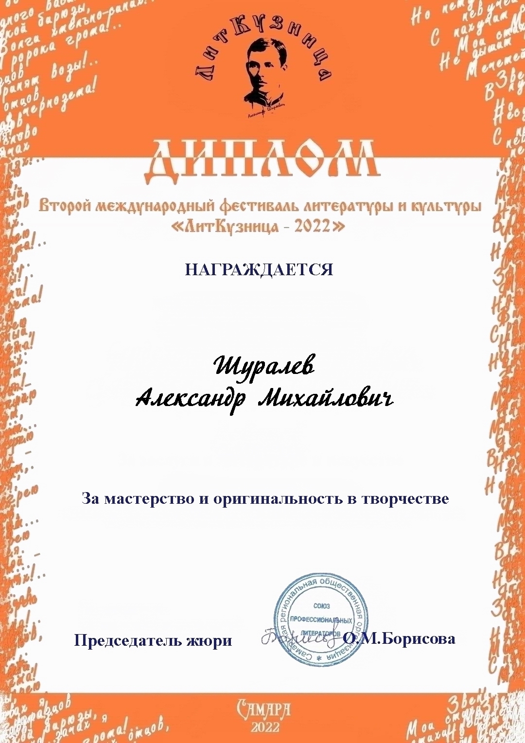 Профессор кафедры русской литературы БГПУ им. М.Акмуллы, доктор педагогических наук Александр Шуралёв вошёл в шорт-лист конкурса в номинации «Поэзия» и награждён дипломом «За мастерство и оригинальность в творчестве». В конкурсе приняли участие авторы из Москвы, Санкт-Петербурга, Калининграда, Иркутска, Самары и многих других городов и областей России, а также из Беларуси, Болгарии, Израиля, Литвы, Эстонии, Германии, США, Узбекистана, Казахстана.