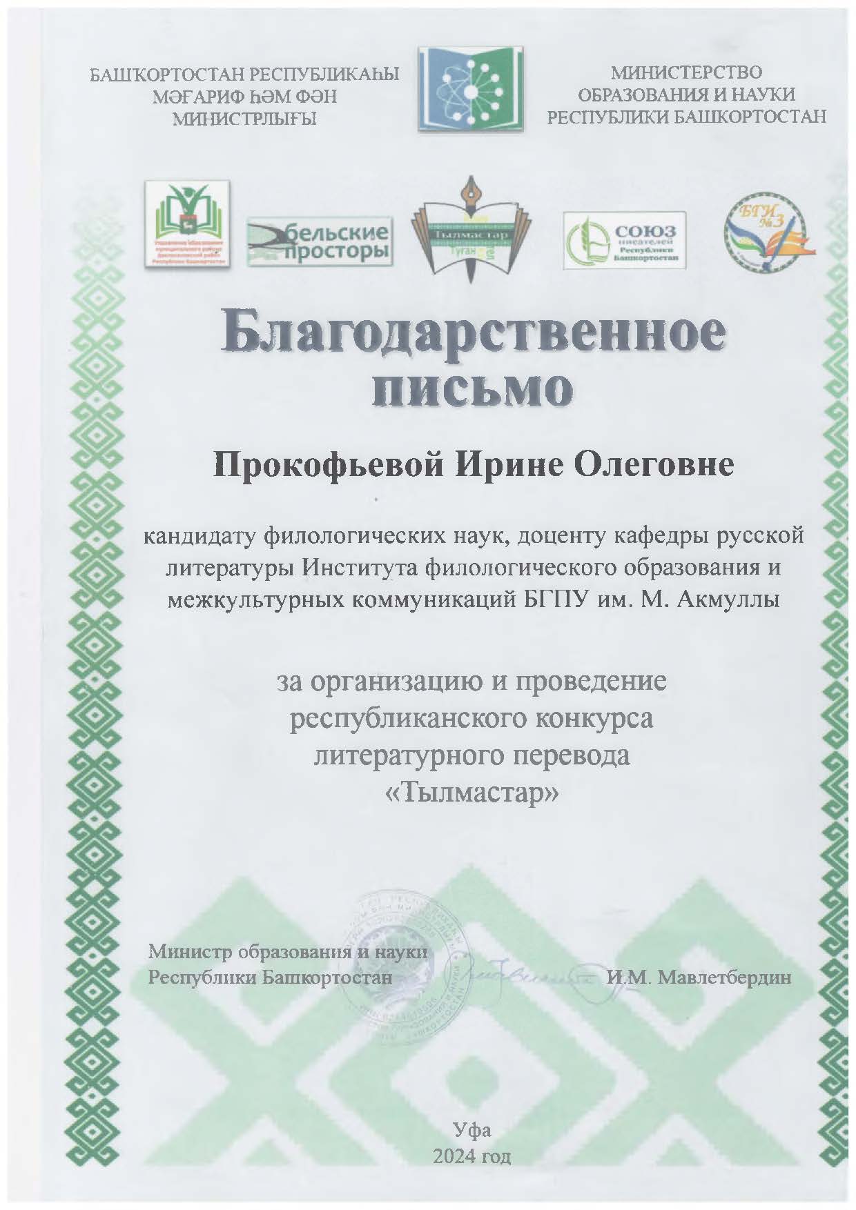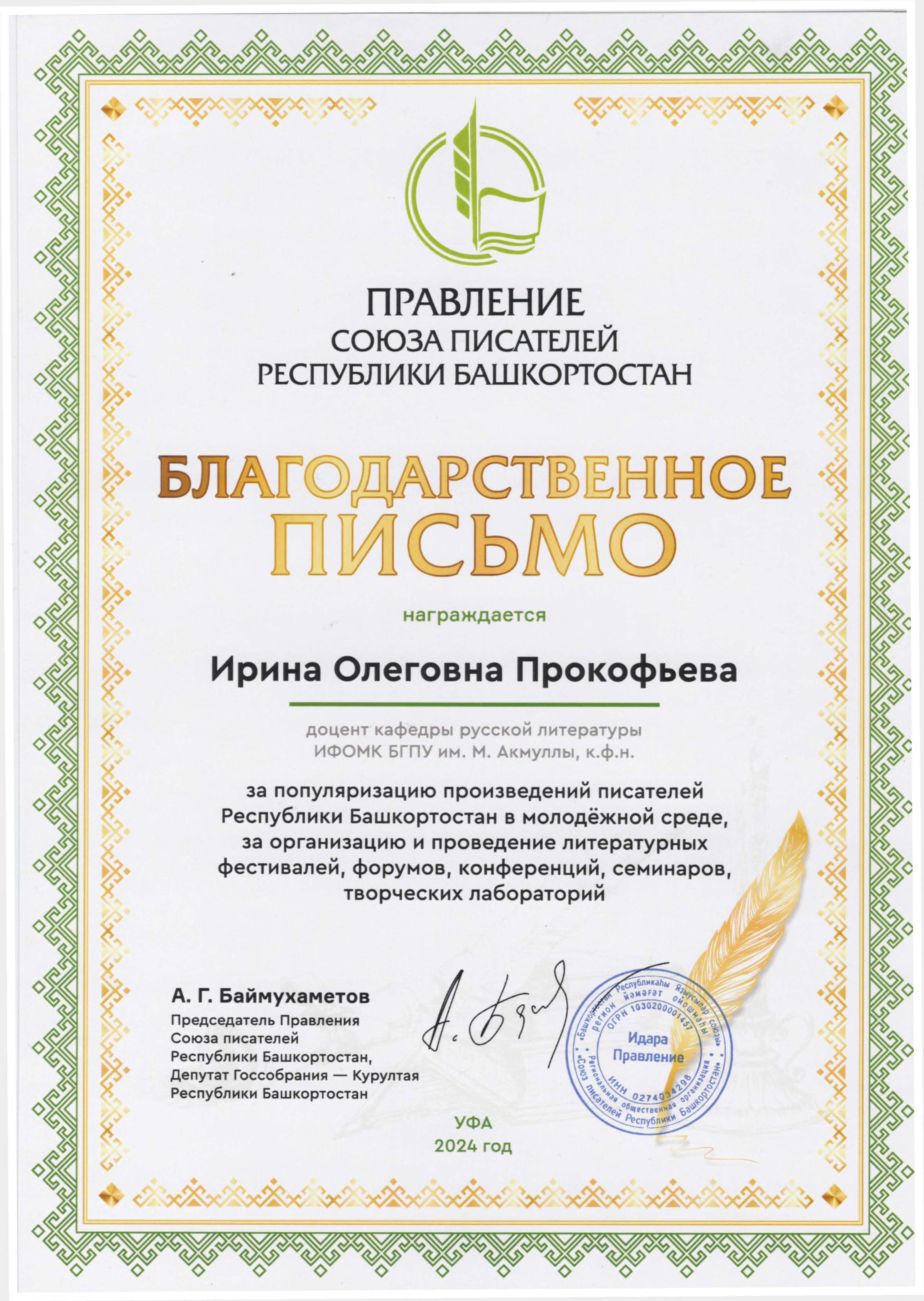 По итогам прошедшего 2024 года культурно-просветительская деятельность доцента кафедры русской литературы И.О. Прокофьевой отмечена благодарственными  письмами. За активную профориентационную и культурно-просветительскую работу со школьниками и студентами, за популяризацию произведений писателей РБ в молодёжной среде, за организацию и проведение литературных фестивалей, форумов, творческих встреч, Республиканского конкурса литературного перевода «Талмастар» доценту кафедры русской литературы Ирине Олеговне Прокофьевой вручены Благодарственные письма  Министерства образования и науки РБ и Правления Союза писателей РБ.
