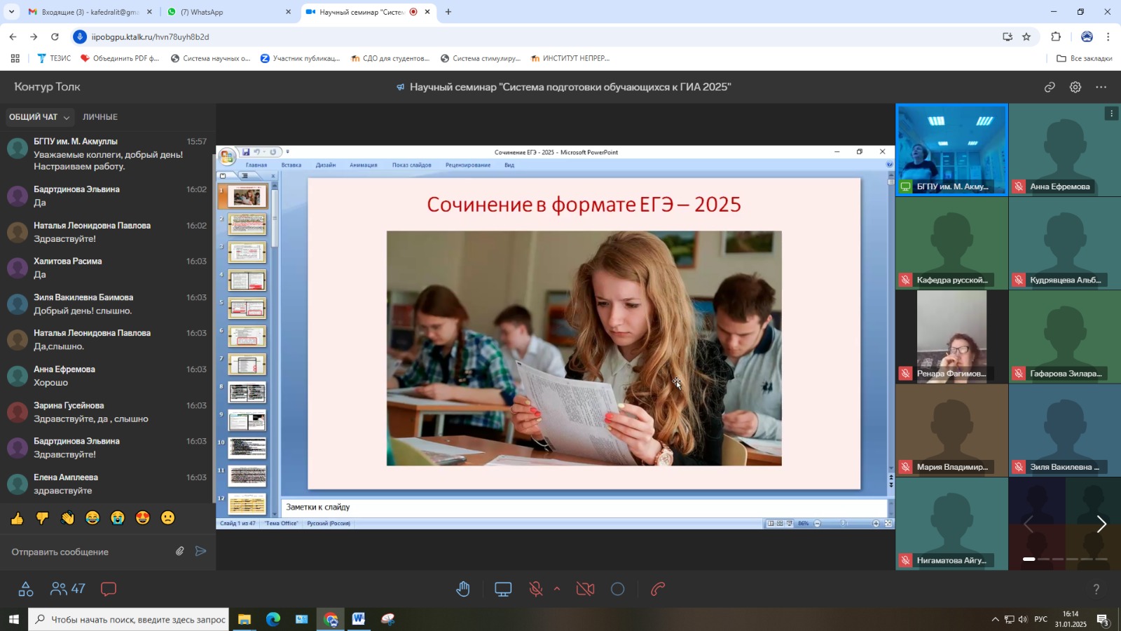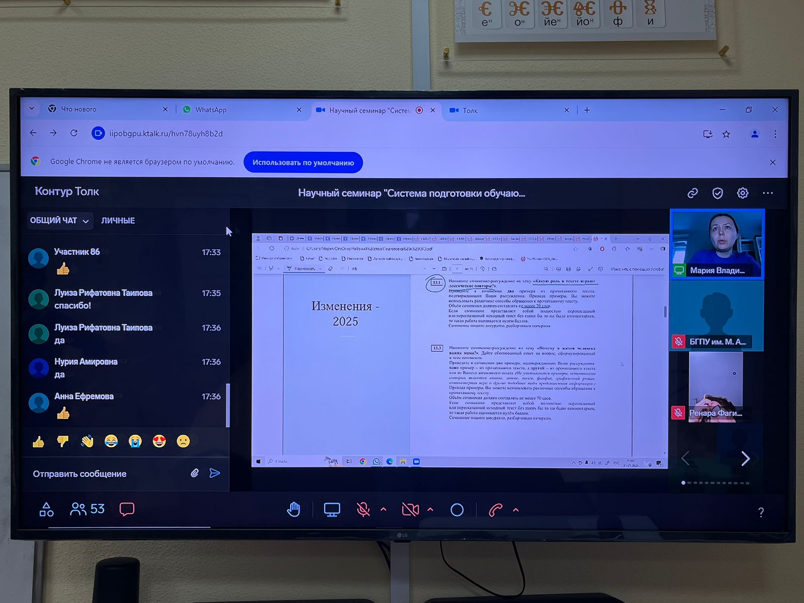 С 31 января по 1 февраля 2025 г. на базе БГПУ им. М. Акмуллы состоялся Республиканский научно-методический семинар «Система подготовки обучающихся к ГИА-2025 по русскому языку и литературе в свете обновленных требований» в онлайн-формате.