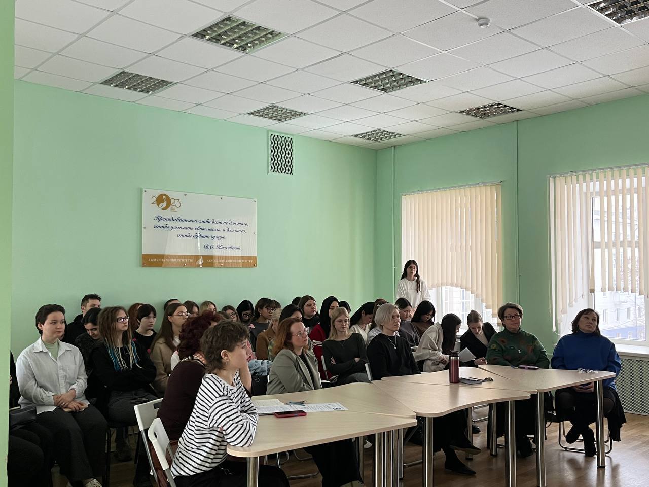 Особое впечатление на студентов произвело выступление учителя, которое было посвящено  возможности внедрения в процесс образования таких методов, которые будут актуальны для нынешнего поколения и будут способствовать эффективному усвоению материала и сделают чтение литературы популярным. Встреча завершилась неформальной  беседой, в ходе которой студенты просили поделиться мнением опытного наставника,  дать совет относительно тех сложных ситуаций, с которыми они сталкивались в ходе педагогической практики  и профессиональной деятельности.