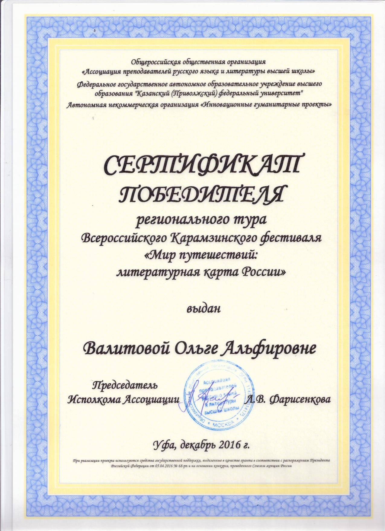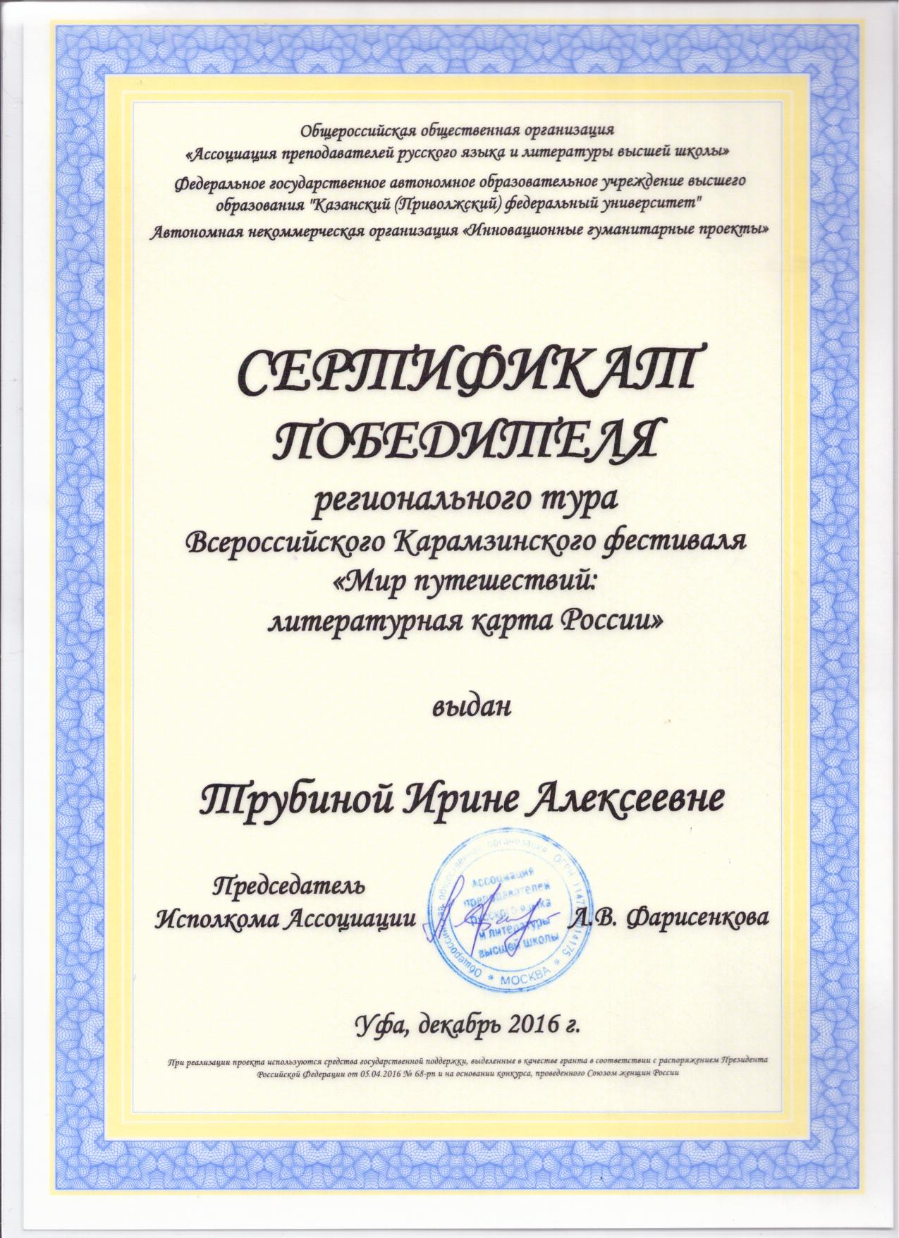 20-21 февраля 2017 года в Казани состоялось закрытие Всероссийского Карамзинского фестиваля, в котором приняли участие студенты 2-3 курсов ИФОМК (профиль «Русский язык и литература»). Победителями регионального тура фестиваля стали Валитова Ольга и Трубина Ирина. Их проект «Литературная гостиная “Великий гражданин земли русской”» был оценен в ряду других исследовательских и творческих работ, представленных от 10 регионов России. Программа фестиваля включала в себя не только презентацию проектов, но и встречу с учеными Казанского федерального университета, знакомство с достопримечательностями столицы Татарстана. Ассоциация преподавателей русского языка и литературы высшей школы выразила благодарность организатору регионального тура фестиваля профессору В.В. Борисовой.