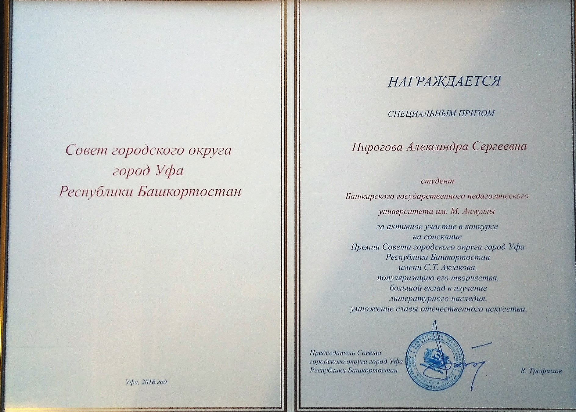 Итоги конкурса подвели в рамках ХХVIII Международного Аксаковского праздника. Среди его победителей и лауреатов – магистрантка кафедры русской литературы Александра Пирогова (научный руководитель – д.ф.н., проф. В.В. Борисова), награжденная благодарственным письмом и специальным призом Премии Горсовета имени С.Т. Аксакова за работу «Сказка С.Т. Аксакова ''Аленький цветочек'' в интермедиальном дискурсе», которая была представлена в формате литературной гостиной. Кафедра русской литературы традиционно принимает активное  участие в Аксаковском конкурсе, победителями которого неоднократно становились студенты ИФОМК БГПУ им. М. Акмуллы.