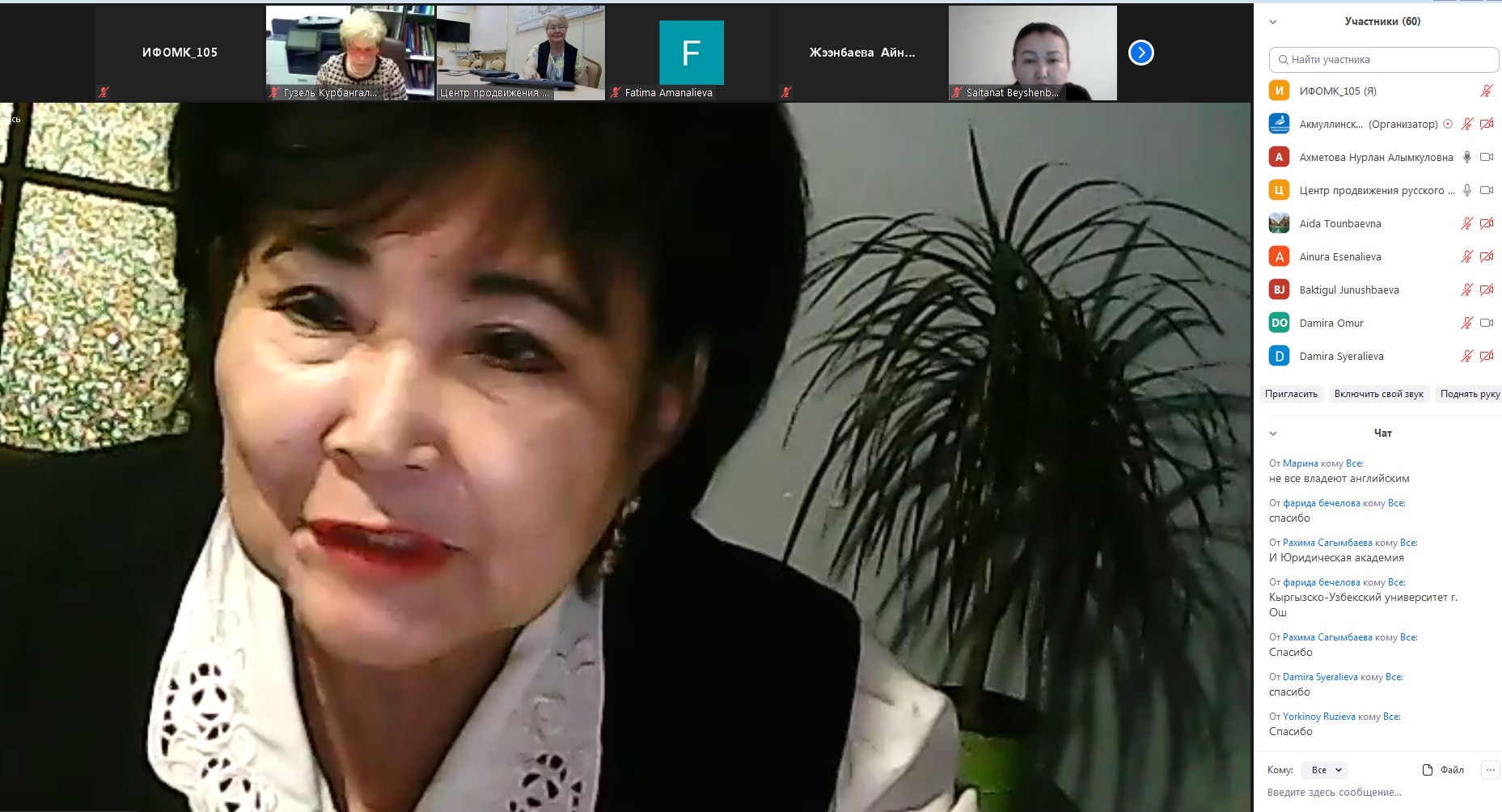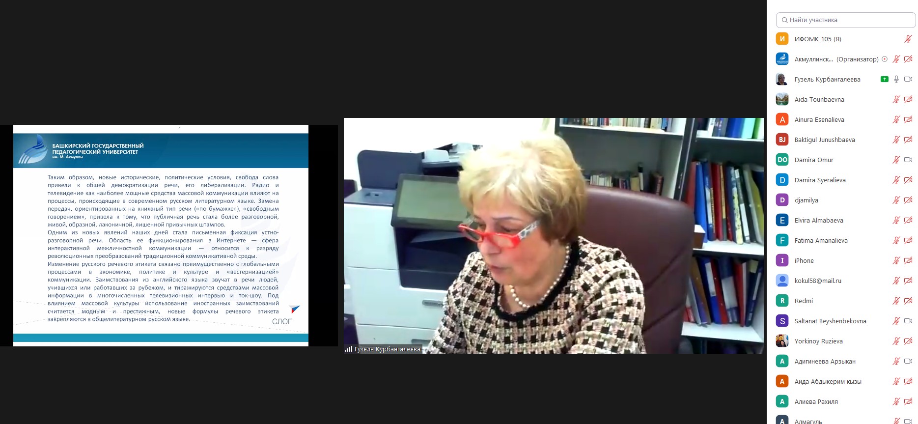 11 декабря кафедра общего языкознания БГПУ им. М. Акмуллы (зав. кафедрой общего языкознания, д.ф.н. профессор Гульнара Франгилевна Кудинова) и межфакультетская кафедра русского языка Кыргызского национального университета им. Жусупа Баласагына (зав. кафедрой, д.п.н., профессор Нурлан Алымкуловна Ахметова) провели очередное онлайн-заседание клуба по интересам «СЛОГ».