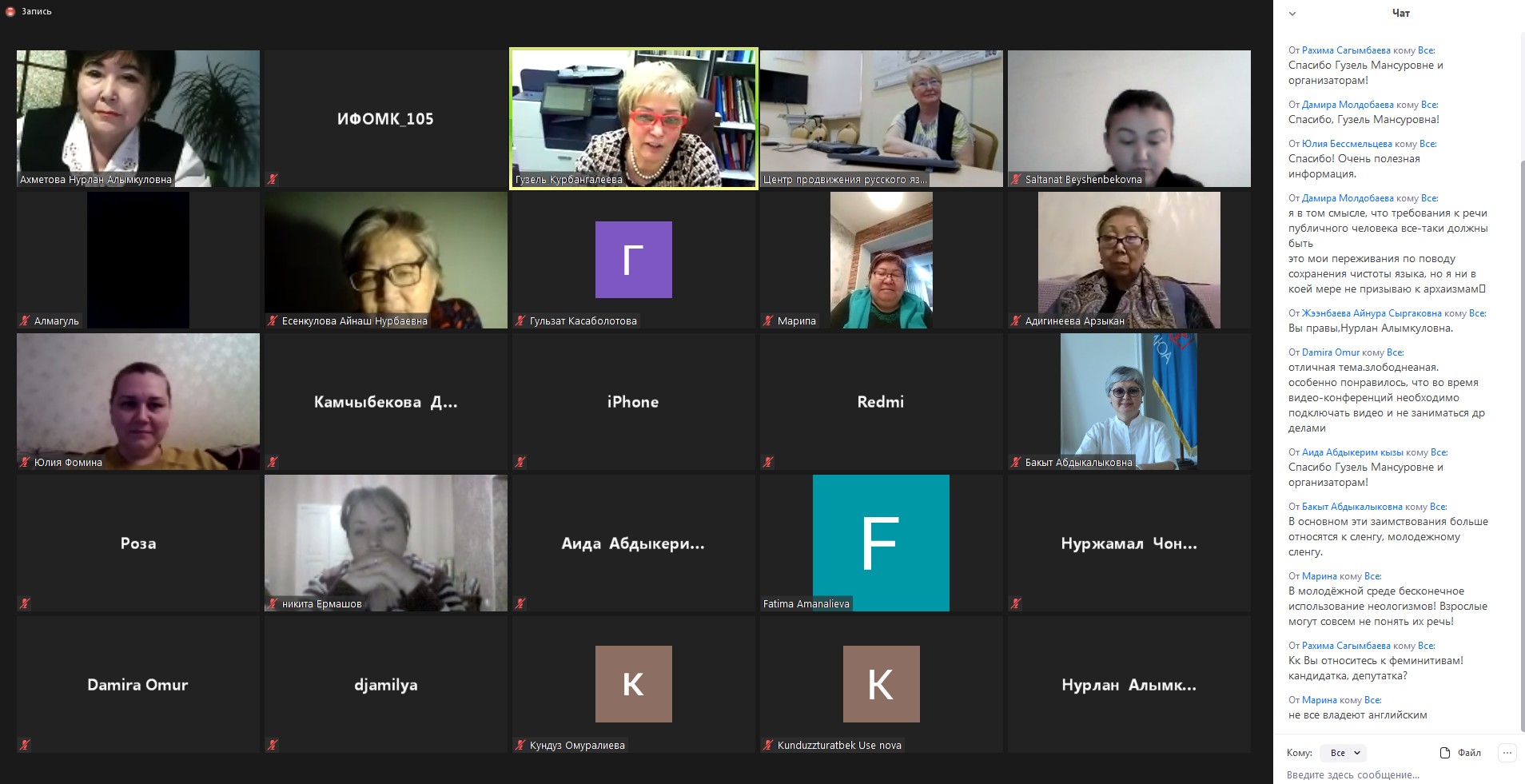 Основой онлайн-общения стала лекция к.ф.н., доцент кафедры общего языкознания Гузель Мансуровны Курбангалеевой "Новые процессы в русском речевом этикете". Докладчик обратила внимание аудитории на непростую проблему в России обращения к незнакомым людям.