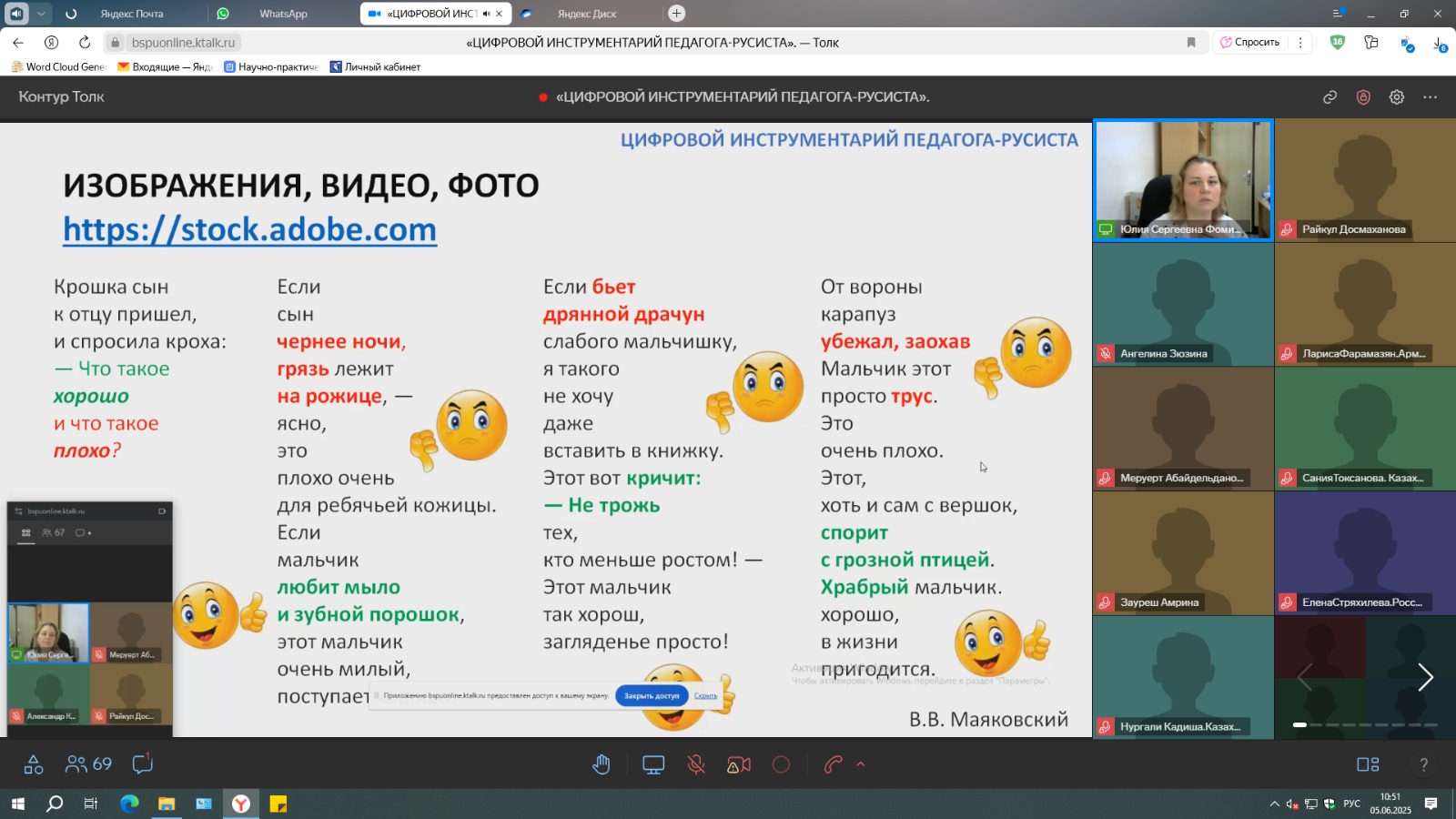 Доцент кафедры русского языка, теоретической и прикладной лингвистики Юлия Фомина продемонстрировала возможности применения цифровых инструментов для представления учебной информации на уроках РКИ в визуальном виде. Изображения, фотографии, анимация, интерактивные плакаты, ментальные карты, облака слов, универсальные дидактические игры, фейковые чаты – это далеко не полный перечень визуальных средств, которые рекомендуется использовать педагогам при изучении и повторении лексики и грамматики русского языка, развитии устной и письменной речи, в том числе в форме диалога.