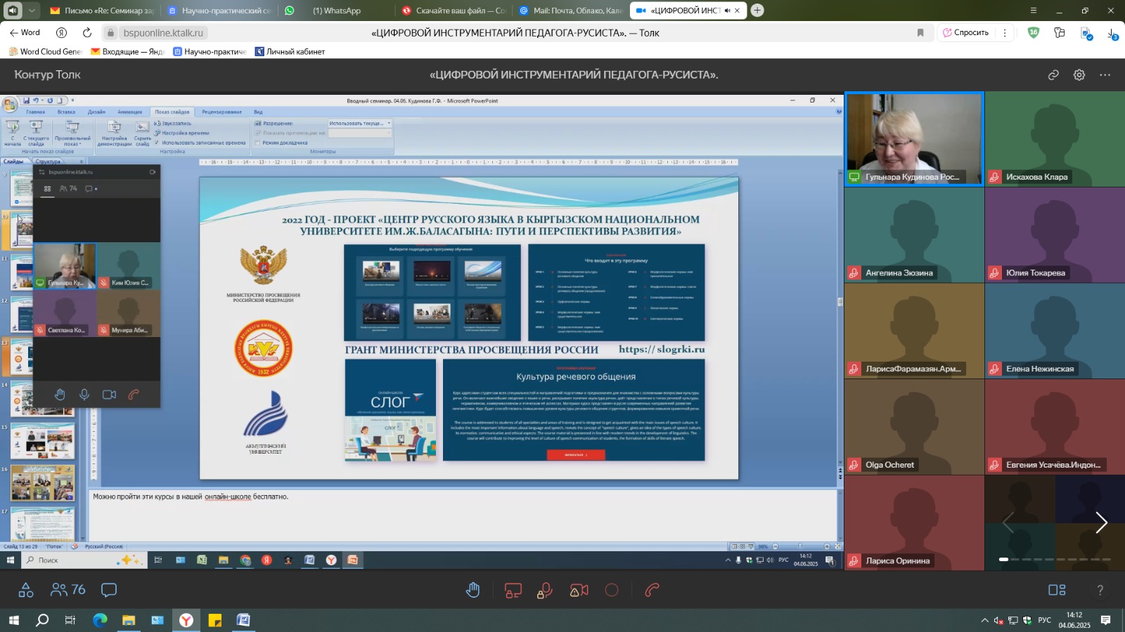 Очный этап онлайн-семинара проходил в июне 2025 года, а последующие 2 летних месяца были посвящены индивидуальным консультациям. Преподавателей Акмуллинского университета порадовали высокие баллы, полученные участниками по итогам тестирования. Среди слушателей были учителя русского языка как иностранного, методисты, составители учебных программ, авторы учебников, организаторы частных языковых школ, а также граждане России, работающие за рубежом.