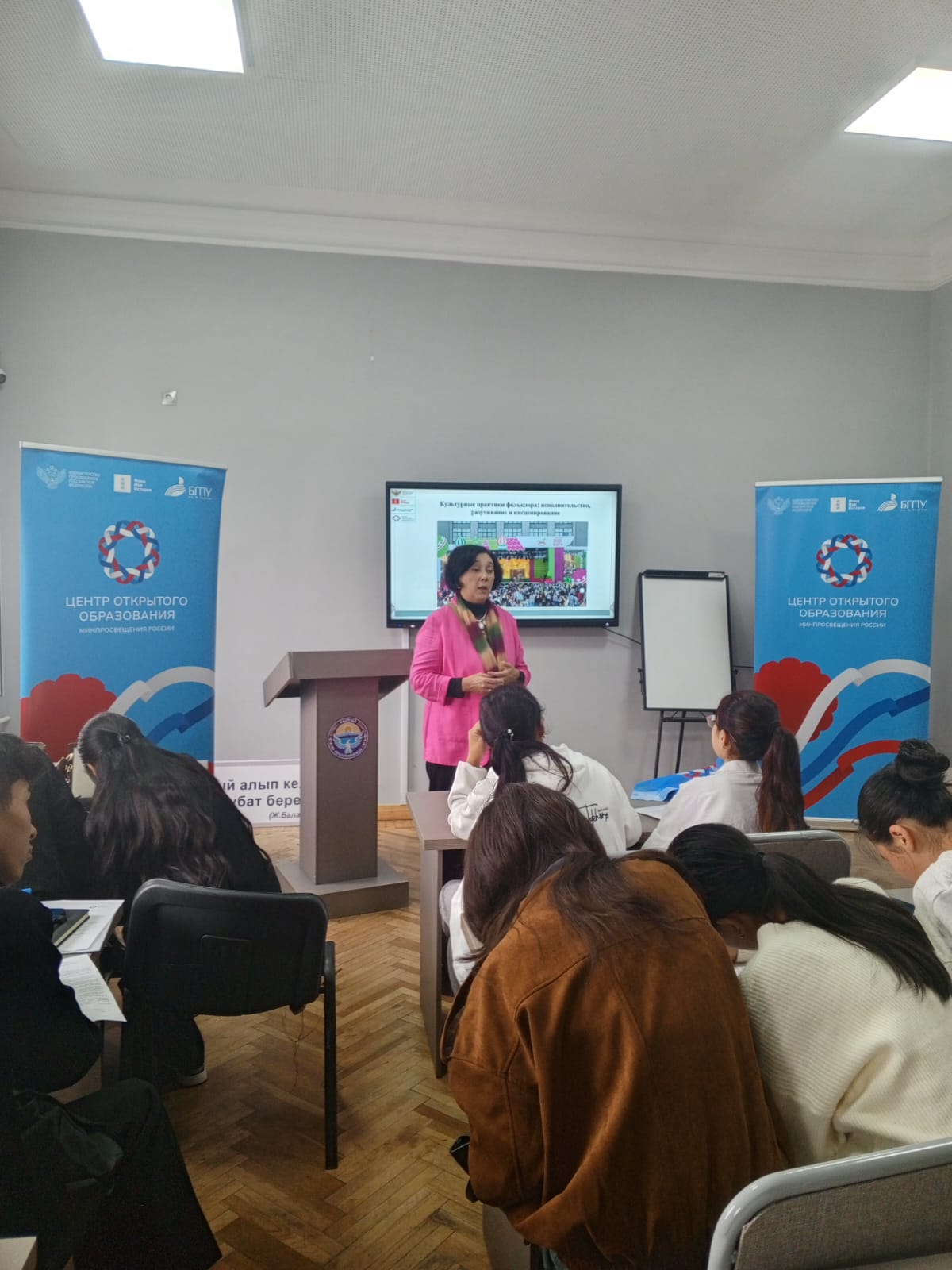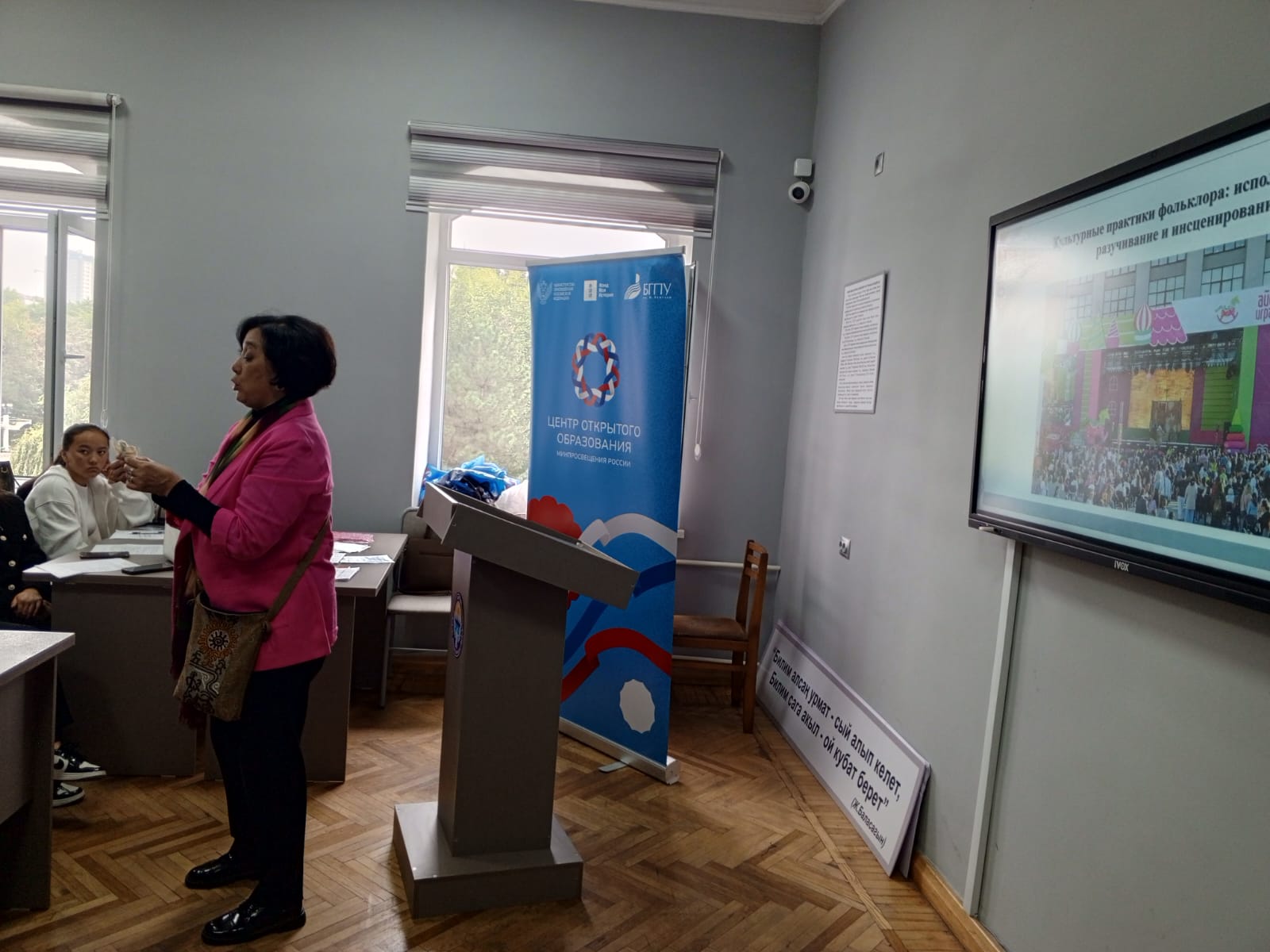 Она раскрыла язык ритуалов и игр в историческом ракурсе, рассказала о философских, исторических и мифологических основах народных игр, фольклорных танцев, праздников, сабантуев и народных традиций в целом. На примере круговых танцев (кыргызского Төгөрек и башкирского Төңөрәк) она показала их общие истоки, динамику развития и функциональное значение в современности. Также были объяснены исторические основы народных спортивных состязаний: куреш, конных скачек, силовых состязаний и культовых танцев. Такая подача материала вызвала большой отклик у аудитории.