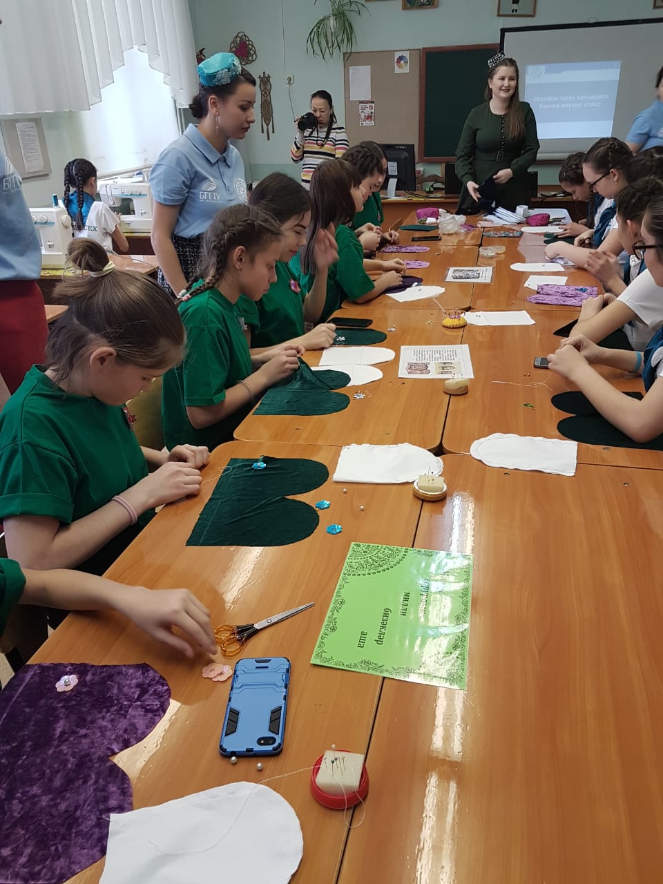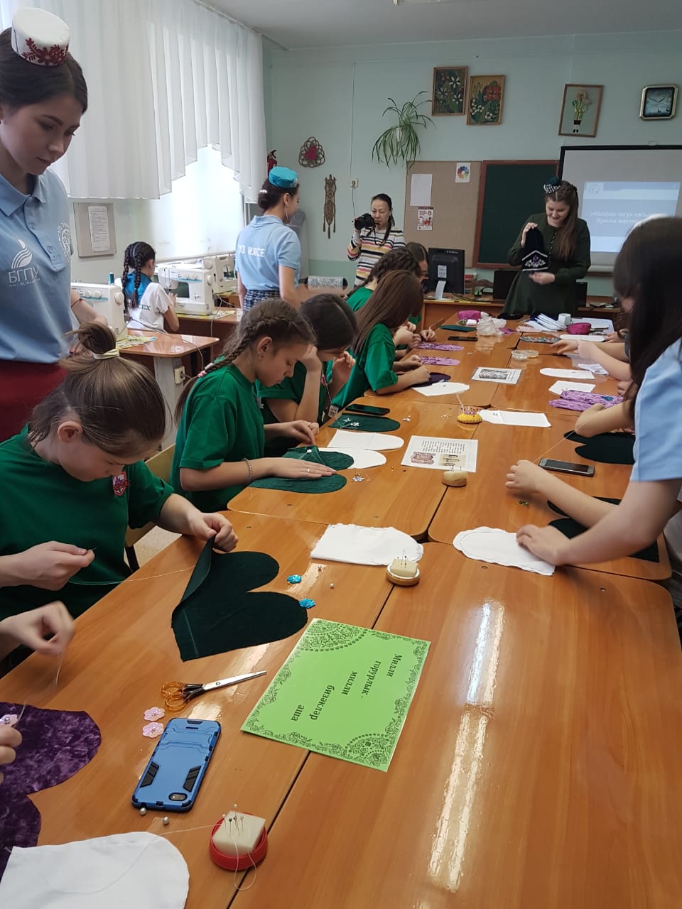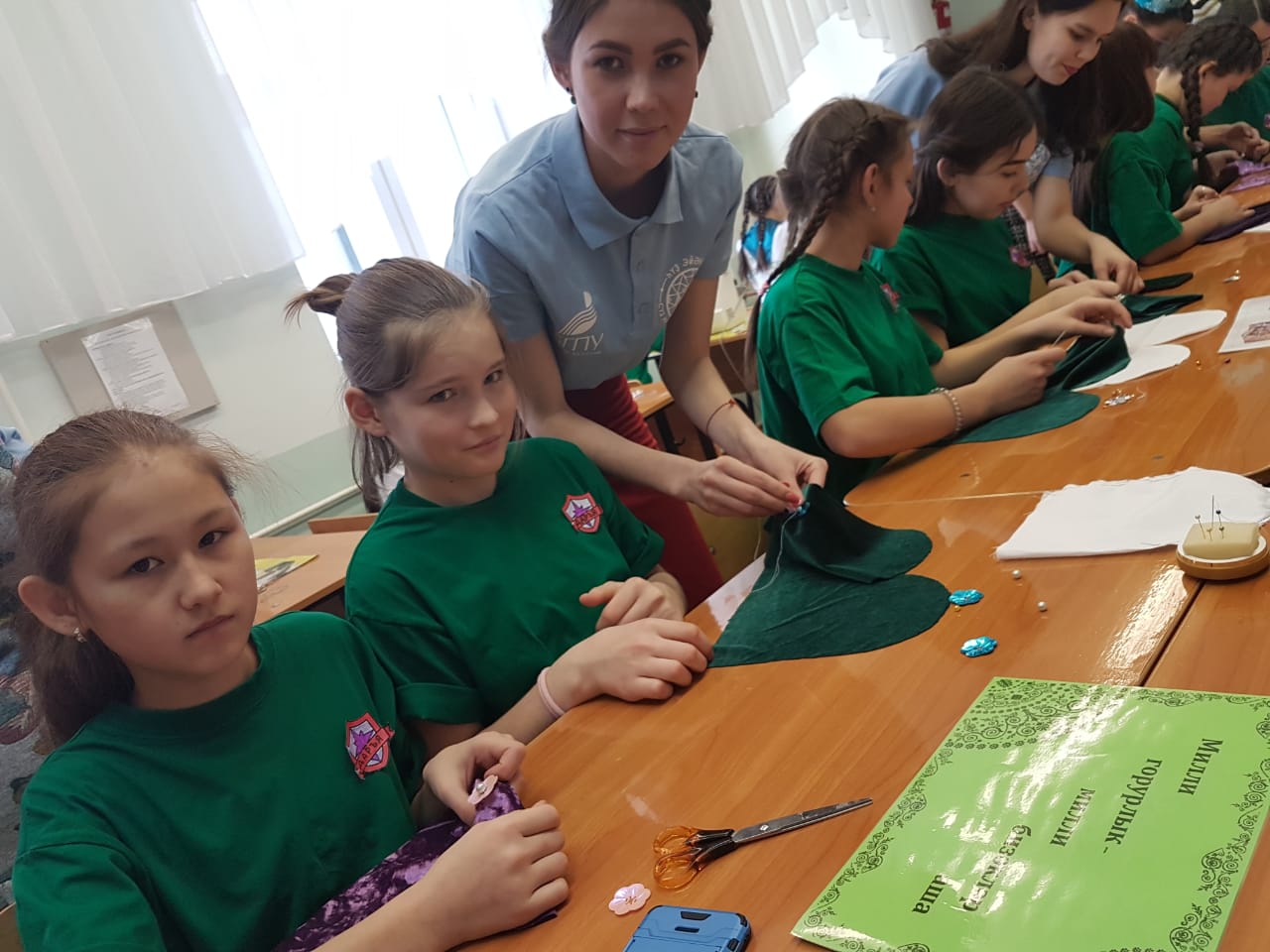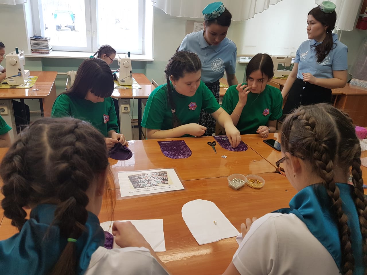 После прохождения квеста ребята выбрали один из трех предложенных мастер классов. Волонтеры татарского языка «Сүз иясе» представили «Мастер класс по изготовлению татарского головного убора – калфака. Слушая историю происхождения головного убора и получив полную инструкцию, под руководством волонтеров обучающиеся принялись за дело. Учащиеся с большим старанием шили свои калфаки и остались довольны результатом. Мастер класс получился ярким и плодотворным благодаря интерактивному иллюстративному материалу и приятной дружеской атмосфере, которую сумели создать волонтеры вместе с учащимися.
