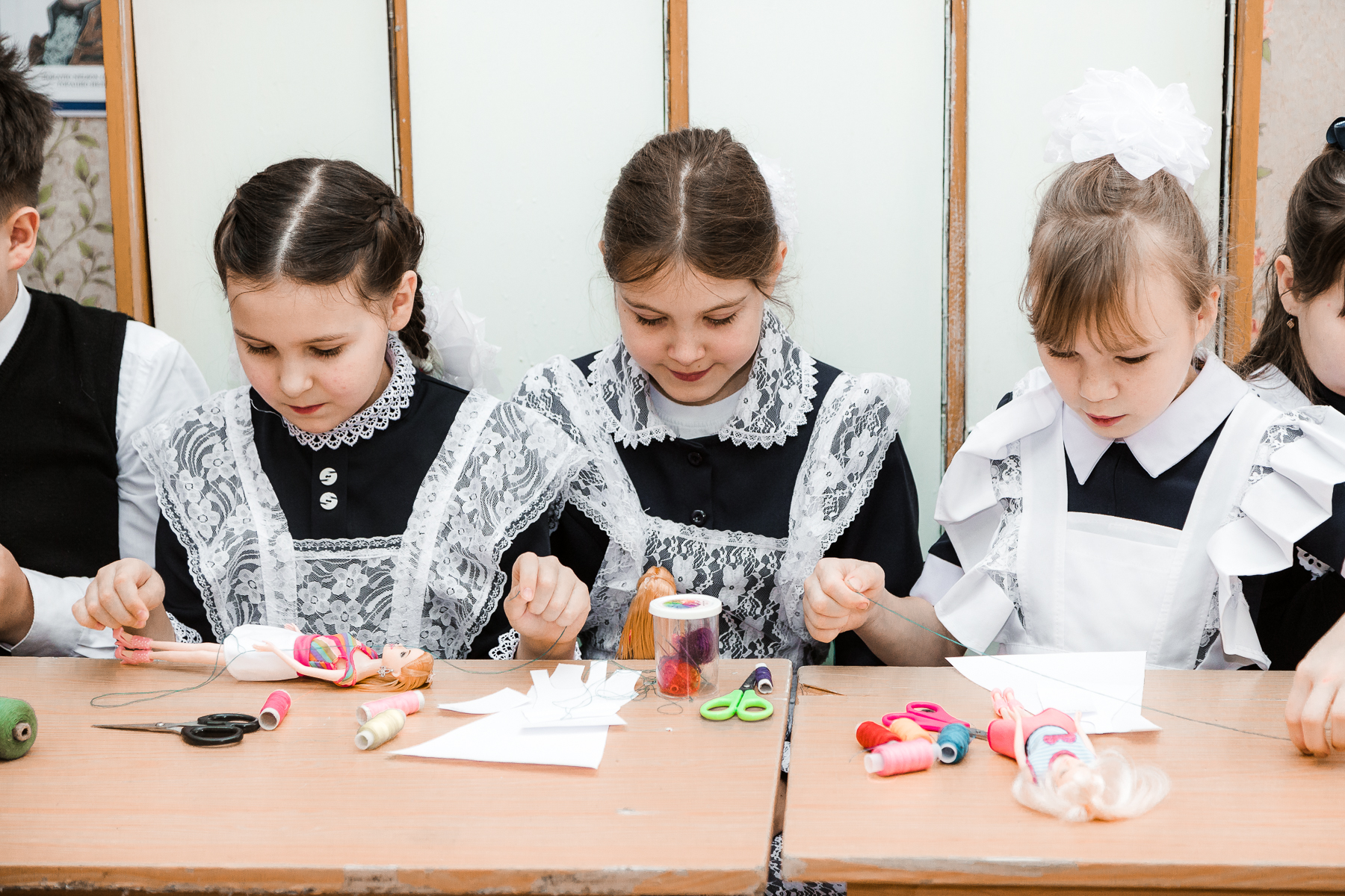 Волонтерами была поставлена задача ознакомления обучающихся татарской национальной одеждой как частью материальной и духовной культуры татарского народа, формирования коммуникативных компетенций на основе живого общения, развития мелкой моторики, конкретных практических навыков, воспитание чувства уважения  и любви к традициям, ценностям, языку родного народа. После встречи с чак-чаком и исполнения под мелодию баяна песни «Туган тел», участники мероприятия вовлеклись в активную деятельность. Презентация сопровождалась проблемными вопросами волонтеров. Ученики провели параллель между одеждами различных народа и узнали, какие цвета и узоры преобладают в татарских,русских и башкирских национальных костюмах. Особенно увлекательной была интерактивная часть – пошив платья куклам. Волонтерами были подобраны ткани, необходимые принадлежности, украшения. В процессе шитья ребята узнали о цветовых особенностях женского платья, об отражении в материальной культуре менталитета, мировоззрения татарского народа, обогатили свой лексикон новыми словами. Особенно заинтересовала учеников безэквивалентная лексика названий одежды и частей одежды татарского и русского народов.  Оказывается, большое количество татарских названий одежды не входит в активный лексический запас. Нужно отметить, что уровень владения татарским языком участников разный, есть дети, для которых татарский язык не является языком общения в семье. Участники экспедиции едины во мнении, что познание «тайны слова» очень интересно и увлекательно, изучение родного языка крайне необходимо и важно. По словам доцента Н.У.Халиуллиной, такие мероприятия имеют большую ценность как для учащихся школы, также и для студента вуза. Последним они полезны в плане получения профессиональных и специальных умений и навыков.