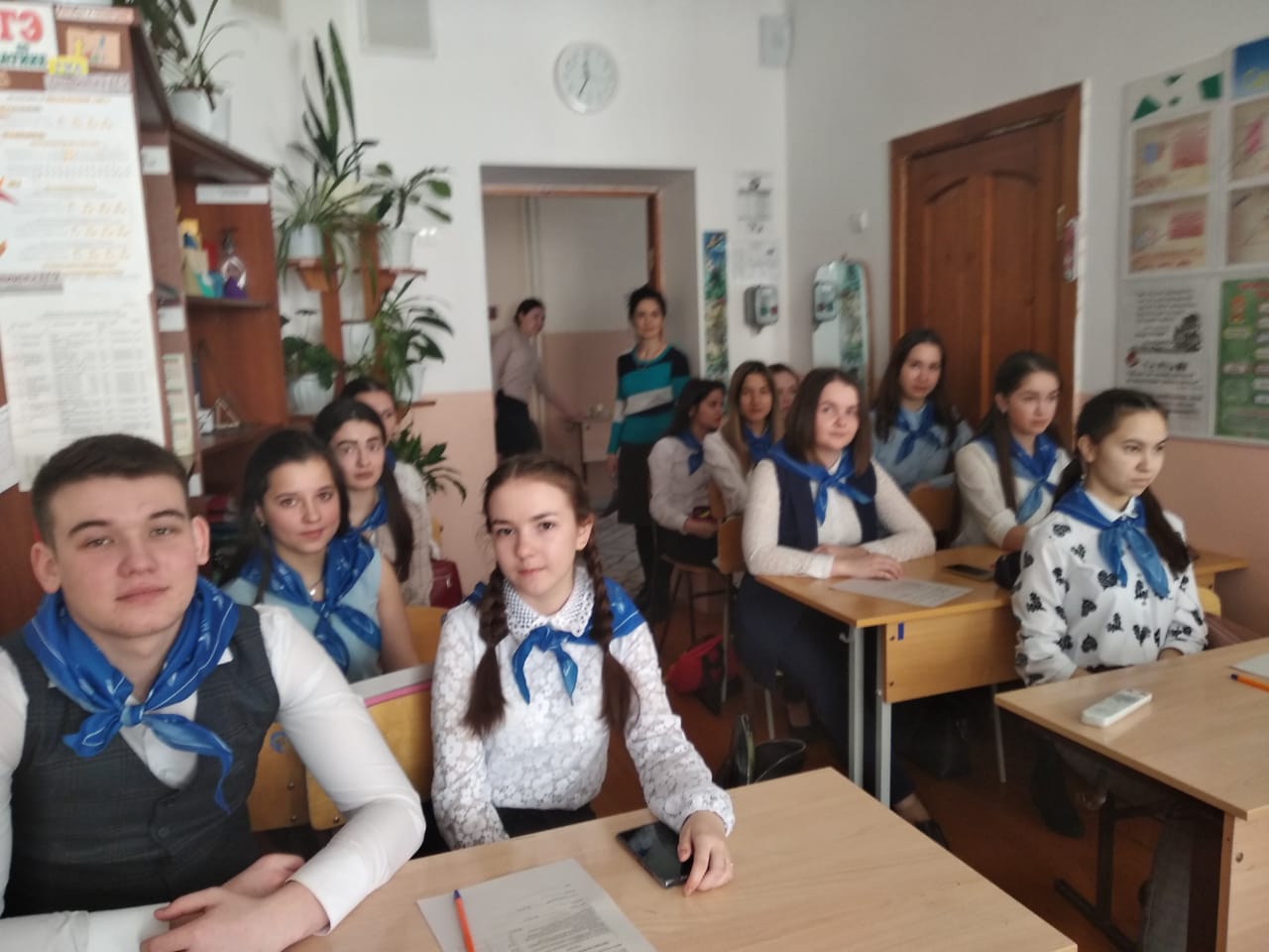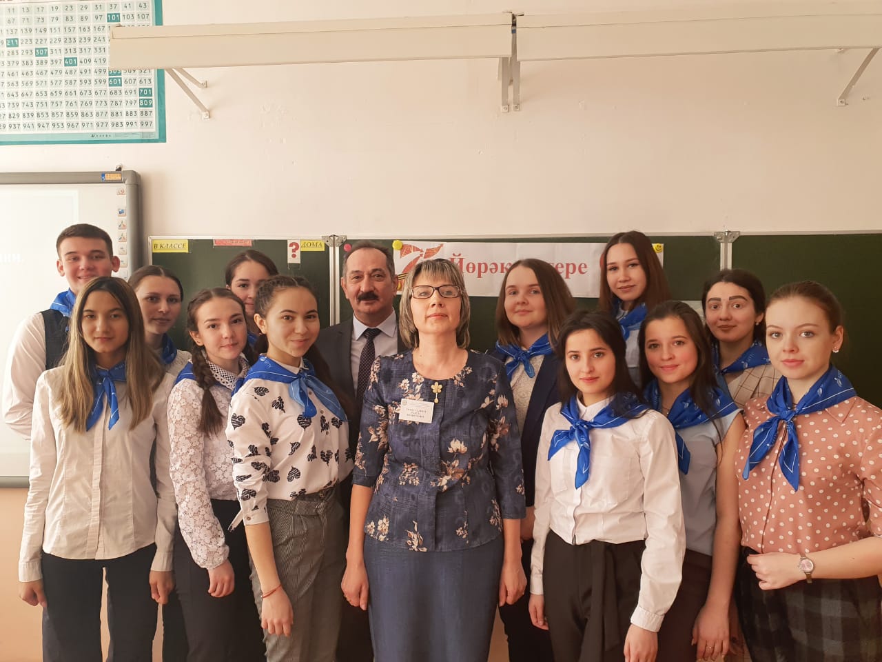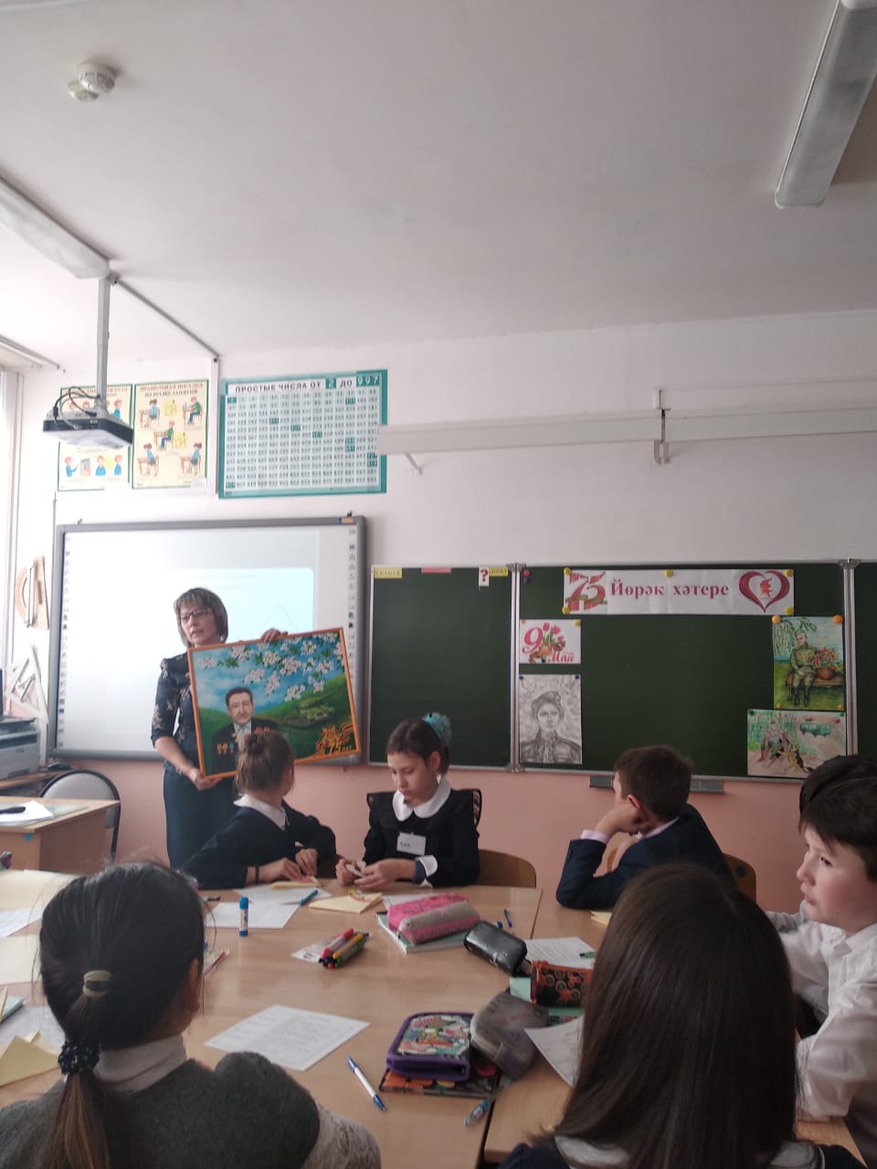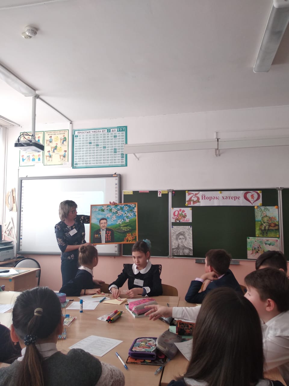 Кстати, в этот день в стенах гимназии как раз проходили открытые уроки участников Республиканского конкурса «Учитель года татарского языка и литературы-2020». Мы присутствовали на открытом классном часе «Без хәтерлибез, без горурланабыз» («Мы помним, мы гордимся») участника конкурса Р.М. Гиззатуллиной – учительницы татарского языка и литературы МАОУ «Татарская гимназия с отделением искусства г. Белебея». Данный классный час был посвящен 75-летию Великой Победе, в ходе которого ученики написали письма ветеранам войны и труда в форме фронтового треугольника времен Великой Отечественной войны.
