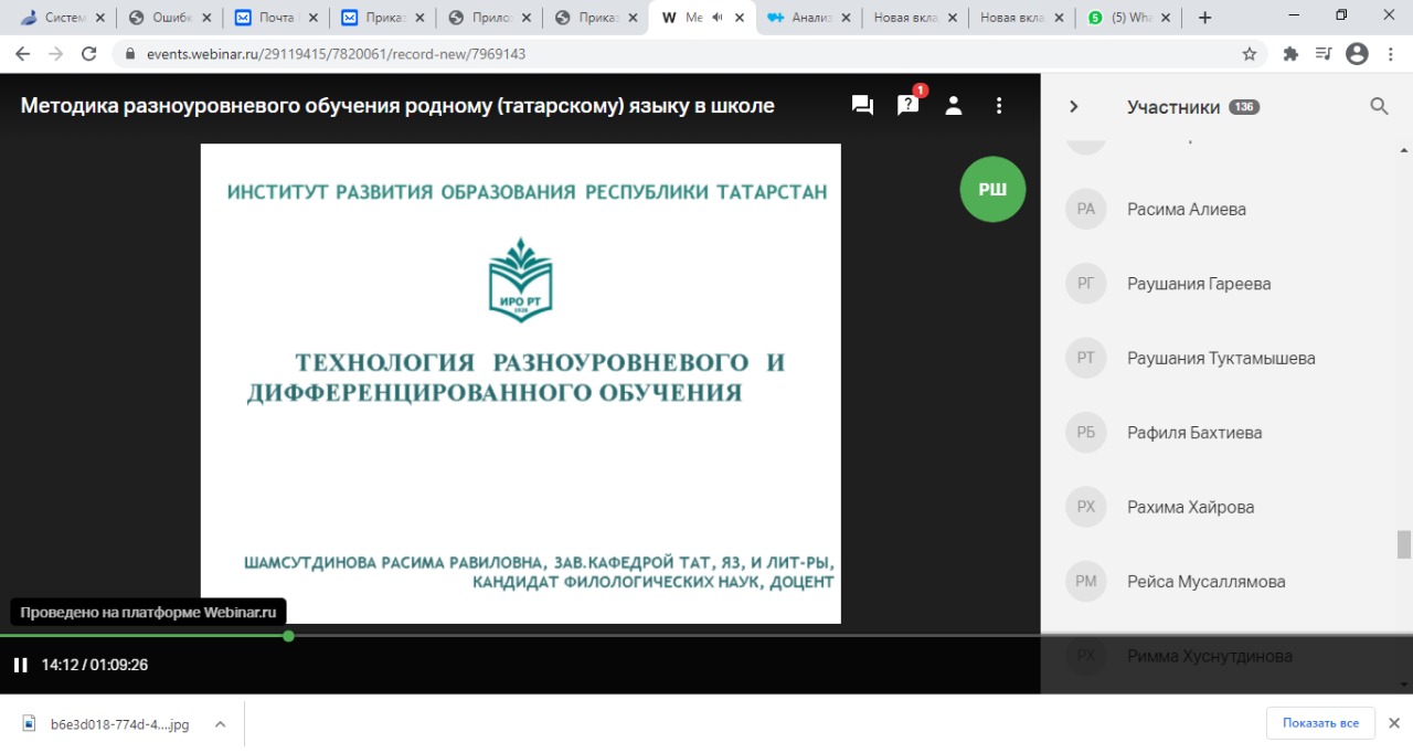 22 января 2021 года преподаватели и студенты кафедры татарского языка и литературы приняли участие в вебинаре в онлайн-режиме для учителей родного (татарского) языка и литературы по теме «Методика разноуровневого обучения родному (татарскому) языку в школе», организованного  Институтом развития образования Республики Татарстан. На вебинар были приглашены учителя татарского языка и литературы с самых различных регионов России. Заведующая кафедрой татарского языка и литературы ИРО РТ Шамсутдинова Расима Равиловна ознакомила участников с особенностями и технологиями разноуровневого и дифференцированного обучения учащихся. Студенты профиля Родной (татарский) язык,  литература и английский язык, участвовавшие на этом мероприятии в рамках дисциплины Теория и методика обучения татарского языка, нашли ответы на многие вопросы, касающегося предмета Татарский язык, новых стандартов обучения и федерального реестра учебников.