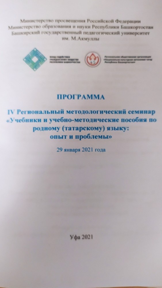 По приказу Министерства образования и науки Республики Башкортостан по составлению учебных пособий по учебному предмету «Татарский язык» для 1-9 классов образовательных организаций Республики Башкортостан с русским языком обучения творческая группа составила примерные учебные программы и учебные пособия. В творческую группу входят ученые кафедры татарского языка и литературы ИФОМК БГПУ им.М.Акмуллы и кафедры татарской и чувашской филологии СФ БашГУ, ведущие учителя татарского языка и литературы ОО РБ. Результаты проделанной работы были обсуждены на заседании IV Регионального методологического семинара «Учебники и учебно-методические пособия по родному (татарскому) языку: опыт и проблемы», который состоялся в г. Уфа 29 января 2021 г.