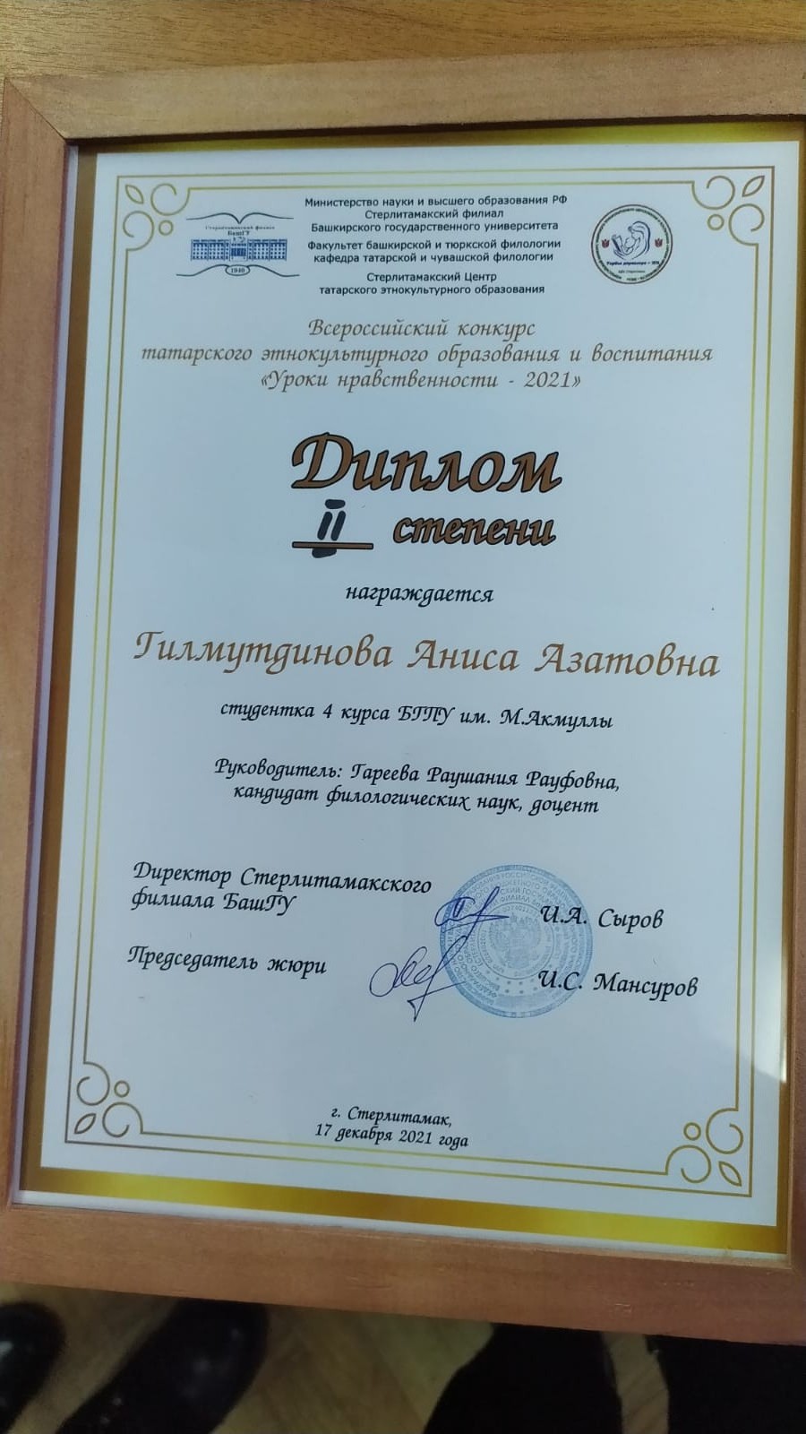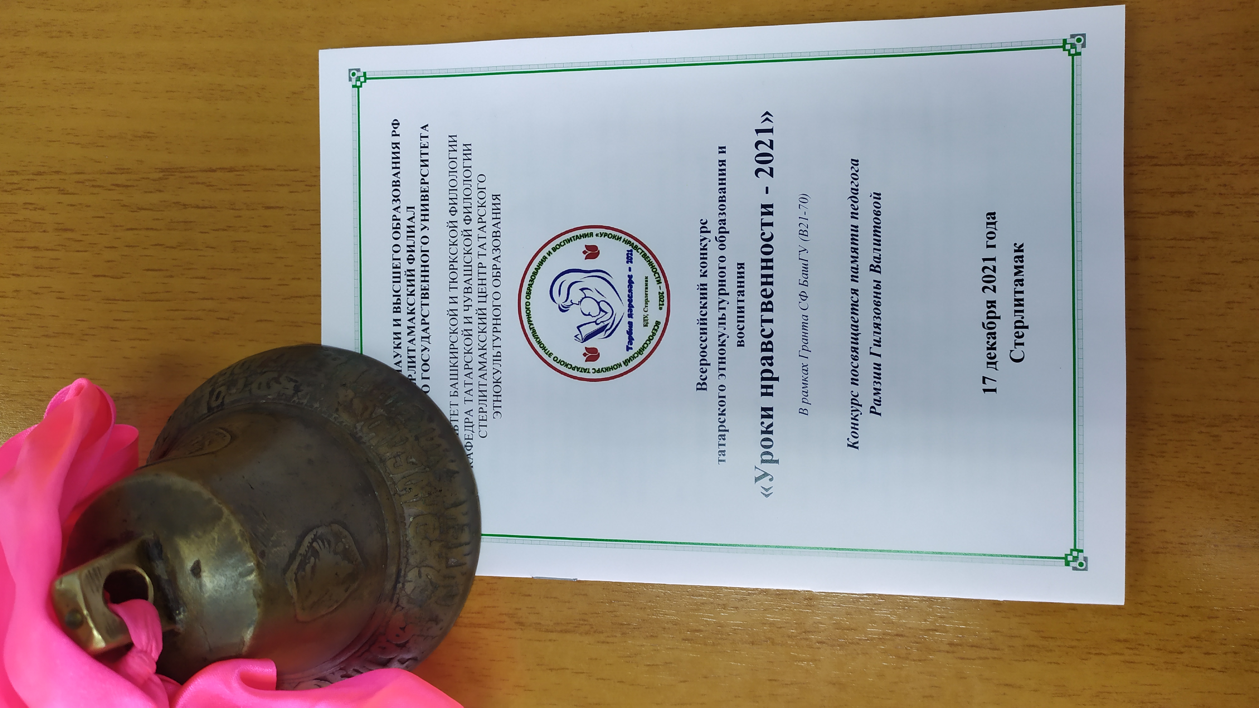 17 декабря  состоялся заключительный этап Всероссийского конкурса татарского этнокультурного образования и воспитания "Тәрбия дәресләре - 2021/Уроки нравственности - 2021". Конкурс был организован в Стерлитамакском филиале Башкирского государственного университета на базе факультета башкирской и тюркской филологии. Целью данного мероприятия было развитие профессиональных компетенций у будущих педагогов и воспитателей по татарскому этнокультурному образованию и воспитанию.
