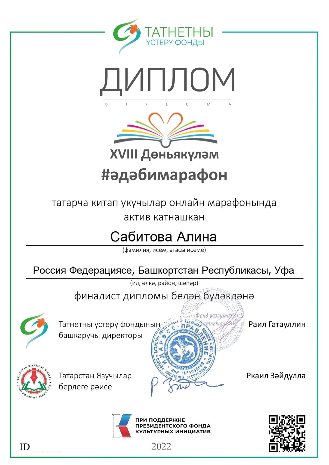 Как сообщает организатор данного проекта Раил Гатауллин, марафон действительно выполняет свою главную цель. С каждым разом участников становится больше, а значит татарский язык и её богатая литература растёт и развивается. Алина Сабитова также является активным членом литературного кружка «Тамчылар», функционирующий при кафедре татарского языка и литературы ИФОМК. Она пробует себя в различных жанрах прозы. Желаем Алине успехов и новых побед!