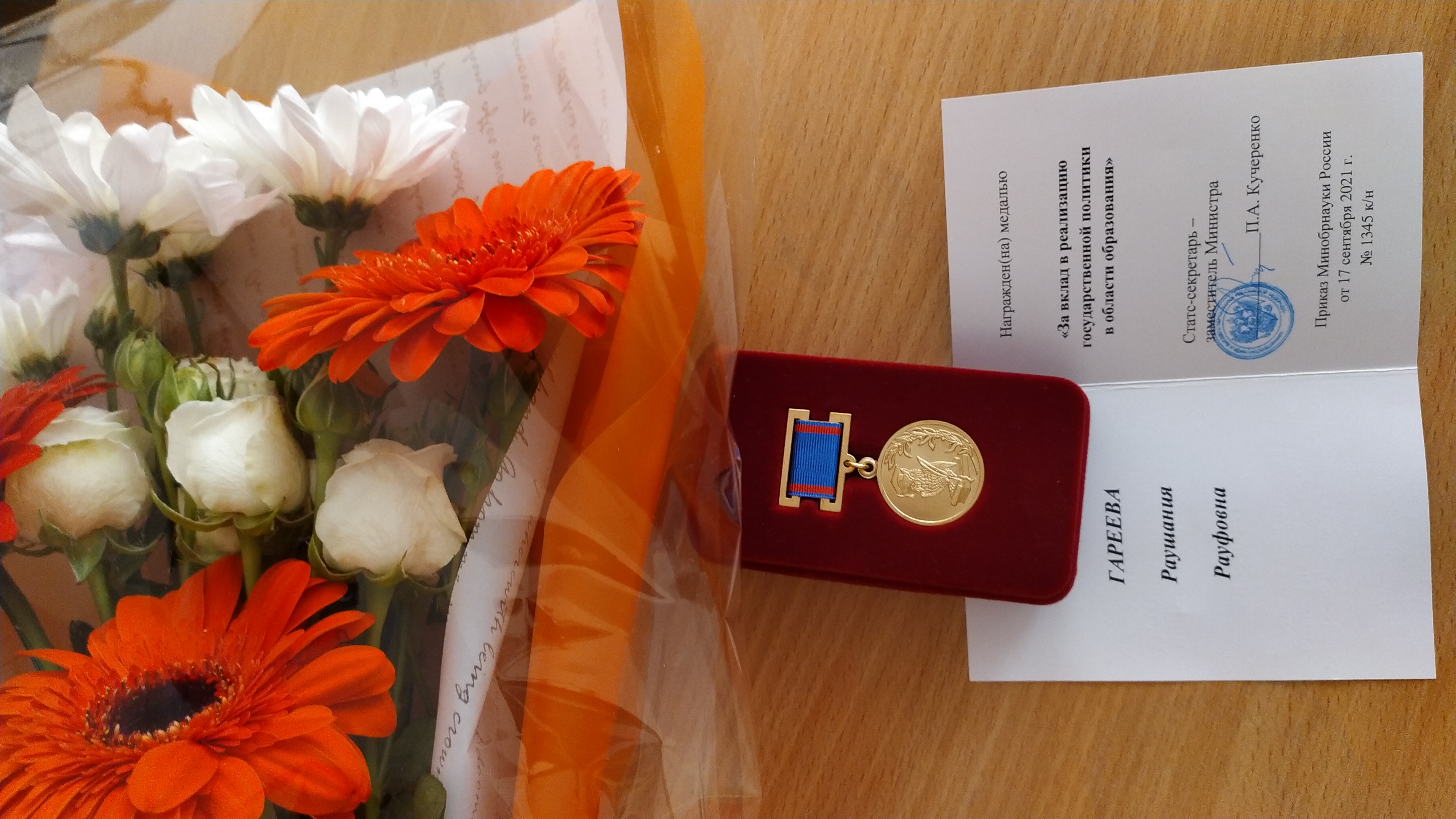 Среди награжденных была и наша коллега – кандидат филологических наук, доцент кафедры татарского языка и литературы ИФОМК Раушания Рауфовна Гареева. Она была награждена Медалью «За вклад в реализацию государственной политики в области образования». Приказ от 17 сентября 2021 года № 1345 к/н Минобрнауки России подписал Статс-секретарь – заместитель министра П.А. Кучеренко.