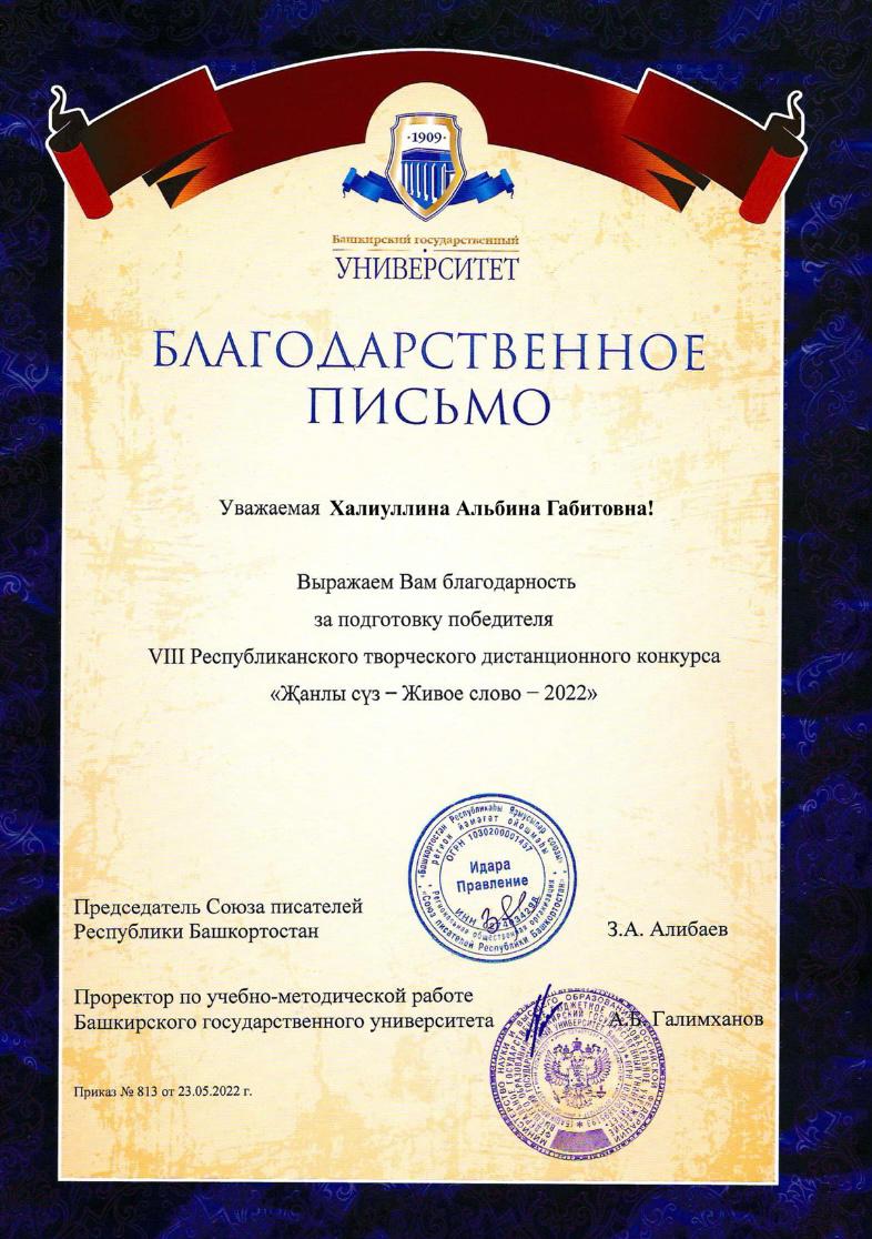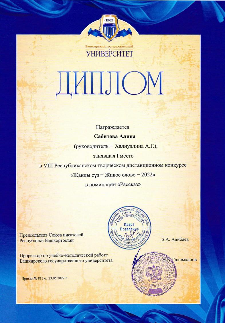Так, 20 июня стало известно, что студентка 1 курса татарского отделения ИФОМК Сабитова Алина стала победителем в VIII творческом республиканском конкурсе «Җанлы сүз - Живое слово - 2022». Организатором этого ежегодного конкурса является кафедра татарской филологии и культуры БашГУ. Руководителем проекта является Сагидуллина Л. Р. - доцент кафедры татарской филологии и культуры БашГУ, член Союза писателей РБ. «Җанлы сүз - Живое слово» нацелен на выявление литературно одаренных учащихся и студентов, способных творчески осмысливать и преобразовывать литературный и языковой материал в соответствии с темой и жанром собственного текста. Участники могут продемонстрировать свои писательские навыки в следующих жанрах: сказки, рассказы, стихи, научно-исследовательская работа, публицистическая статья (эссе, очерк, зарисовка).