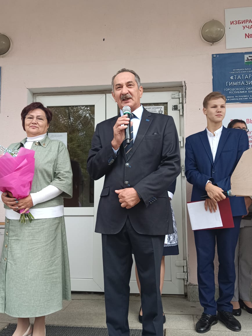 В этот день учеников и учителей с Днем знаний также поздравили и другие гости: И.К. Сухарев – депутат Государственной Думы Федерального Собрания Российской Федерации, первый заместитель председателя ГД по вопросам собственности, земельным и имущественным отношениям; А.А. Галиев – юрист Управления образования администрации ГО г. Уфа; д.филол.н., профессор, писатель Р.К. Амиров.