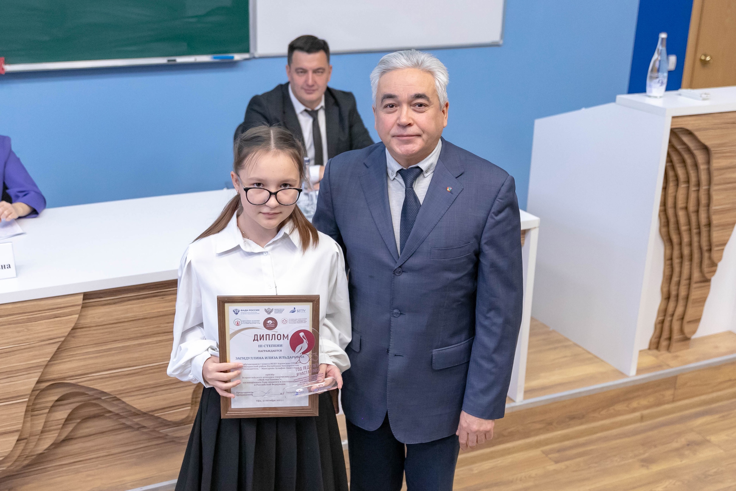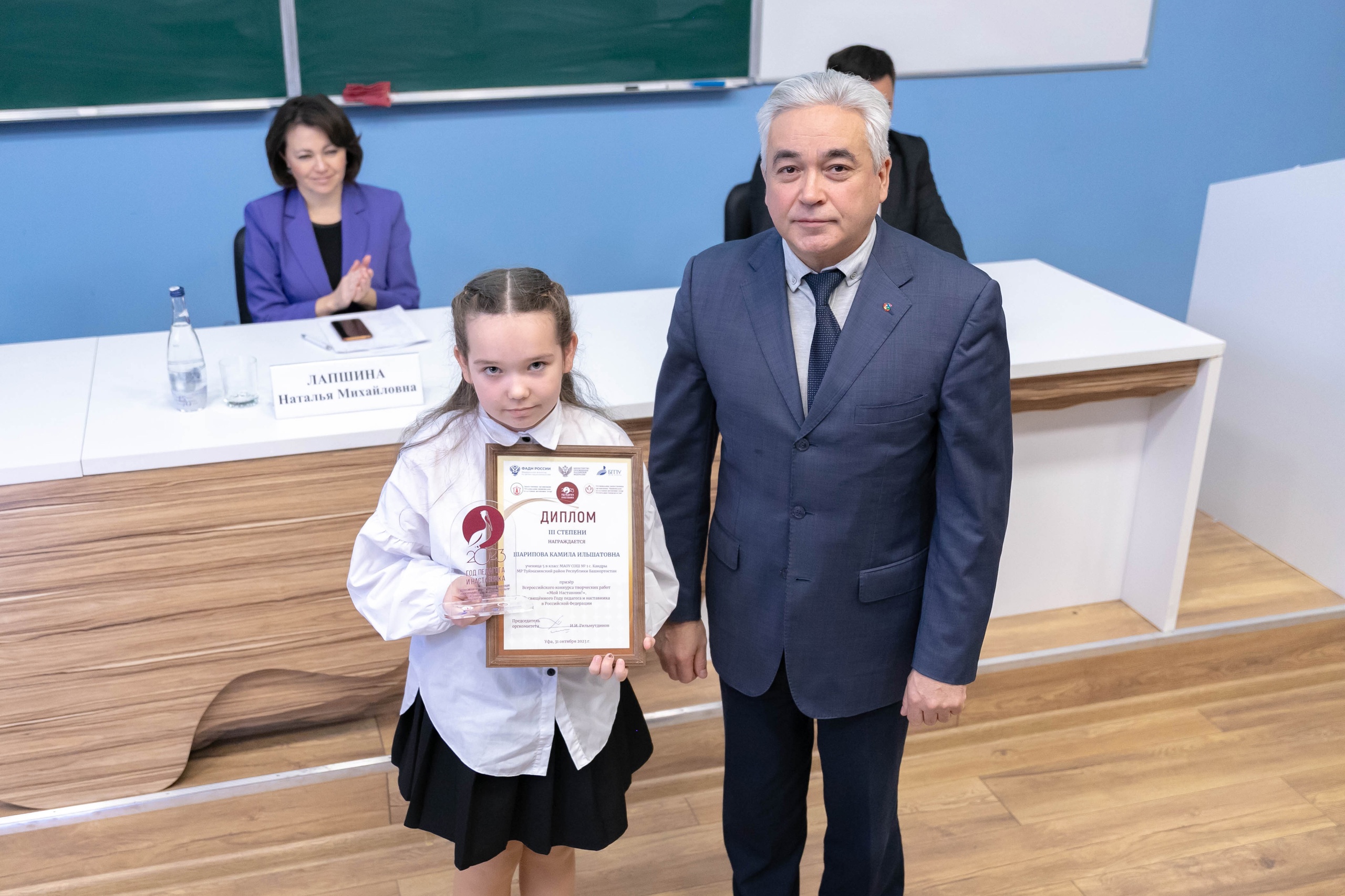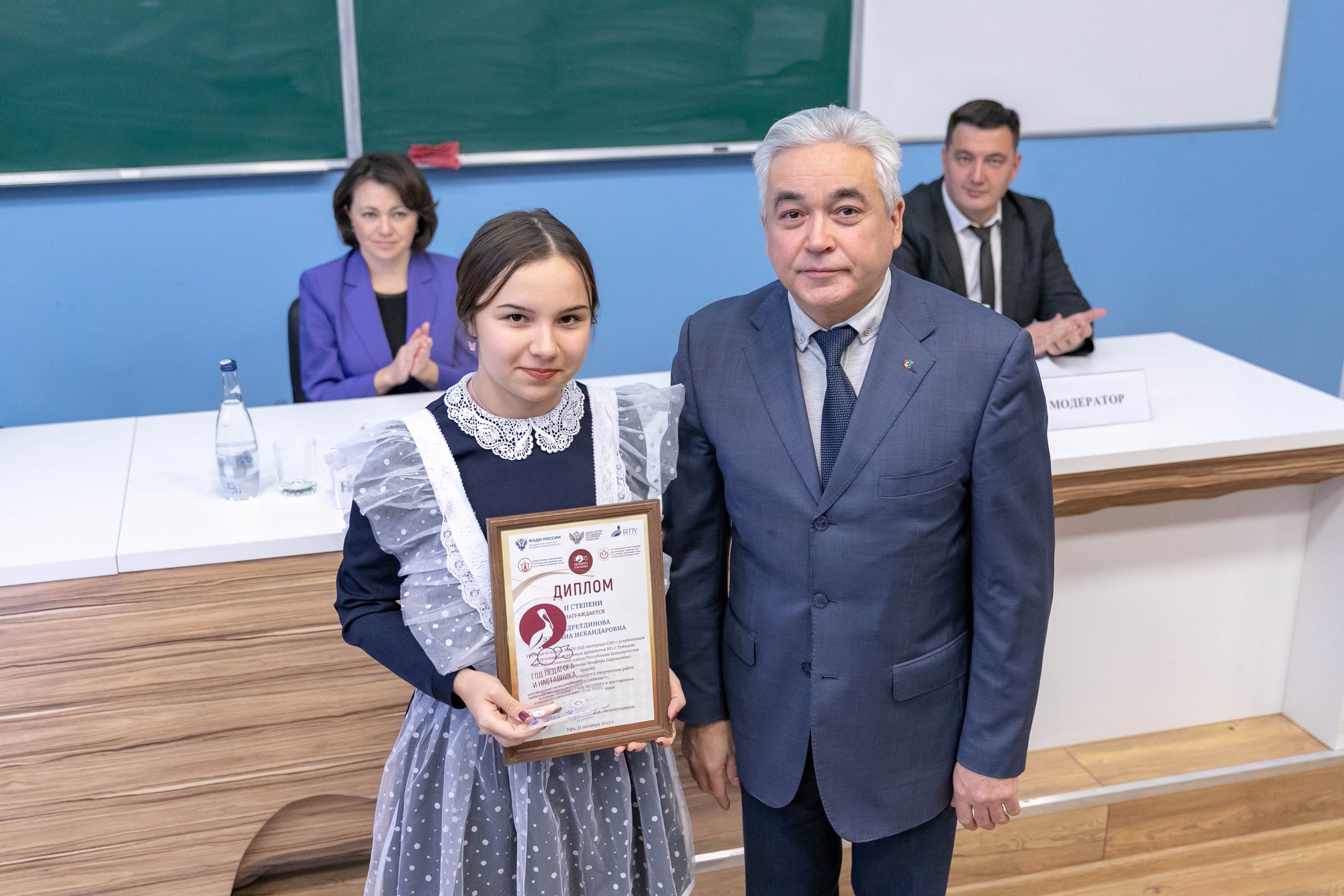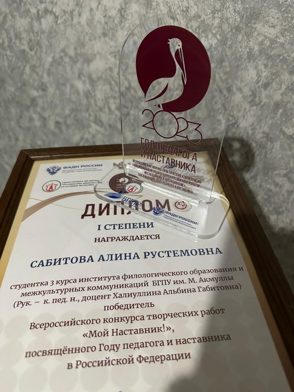 В рамках конференции состоялось вручение наград победителям и призерам Всероссийского конкурса творческих работ «Мой наставник!». Дипломы и подарки победителям и призерам конкурса выручил первый проректор Акмуллинского университета А.Ф. Мустаев. Отрадно отметить, что студентка группы ПОТЯ_АНЯ-31-21 ИФОМК Алина Сабитова стала победителем во Всероссийском конкурсе творческих работ «Мой наставник!», среди участников которого были как студенты, так и учащиеся. Ее работа, посвященная своей маме – учителю русского языка и литературы была высоко оценена жюри. Руководитель проекта – кандидат филологических наук, доцент А.Г. Халиуллина.