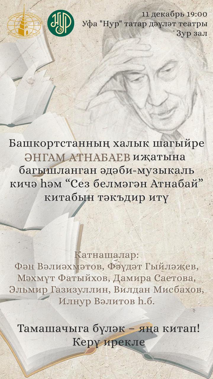Вечером в Уфимском государственном татарском театре «Нур» состоялся вечер-презентация книги «Неизвестный Атнабай». Составителем книги, автором предисловия и комментарий является поэт Рим Идиатуллин, а ответственным редактором – кандидат филологических наук, доцент Альбина Халиуллина. Книга была издана на средства Всемирного конгресса татар в честь 95-летия со дня рождения народного поэта Башкортостана Ангама Атнабаева.