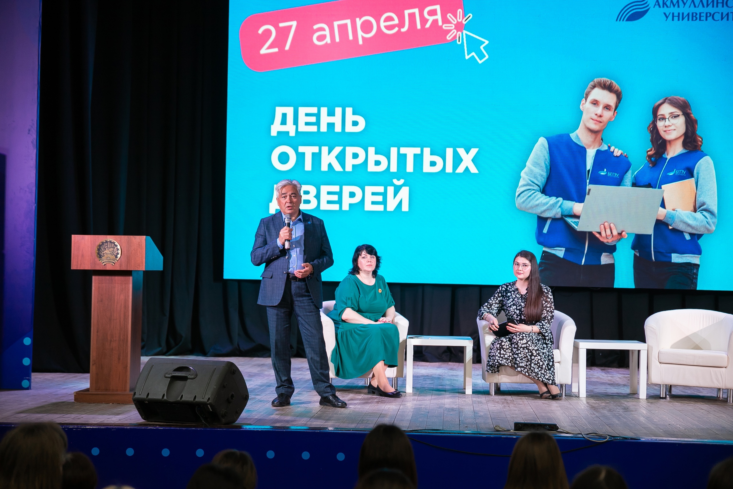27 апреля в БГПУ имени М. Акмуллы состоялся День открытых дверей. Преподаватели и студенты Акмуллинского университета подготовили насыщенную программу. В Концертном зале к гостям обратился первый проректор Акмуллинского университета по стратегическому развитию Алмаз Мустаев: «Педагогический университет всем своим выпускникам, независимо от направления обучения, дает очень важный навык – умение работать с людьми, общаться с ними. А это востребовано во всех сферах жизни. В последние несколько лет значительно изменилось положение педагогов: растет зарплата, появляются новые направления работы, например, советники директоров по воспитательной работе, репетиторство. Профессия учителя дает стабильность, она востребована всегда, во все времена. Хочу пожелать всем выпускникам хорошо подготовиться, отлично сдать экзамены и прийти к нам».