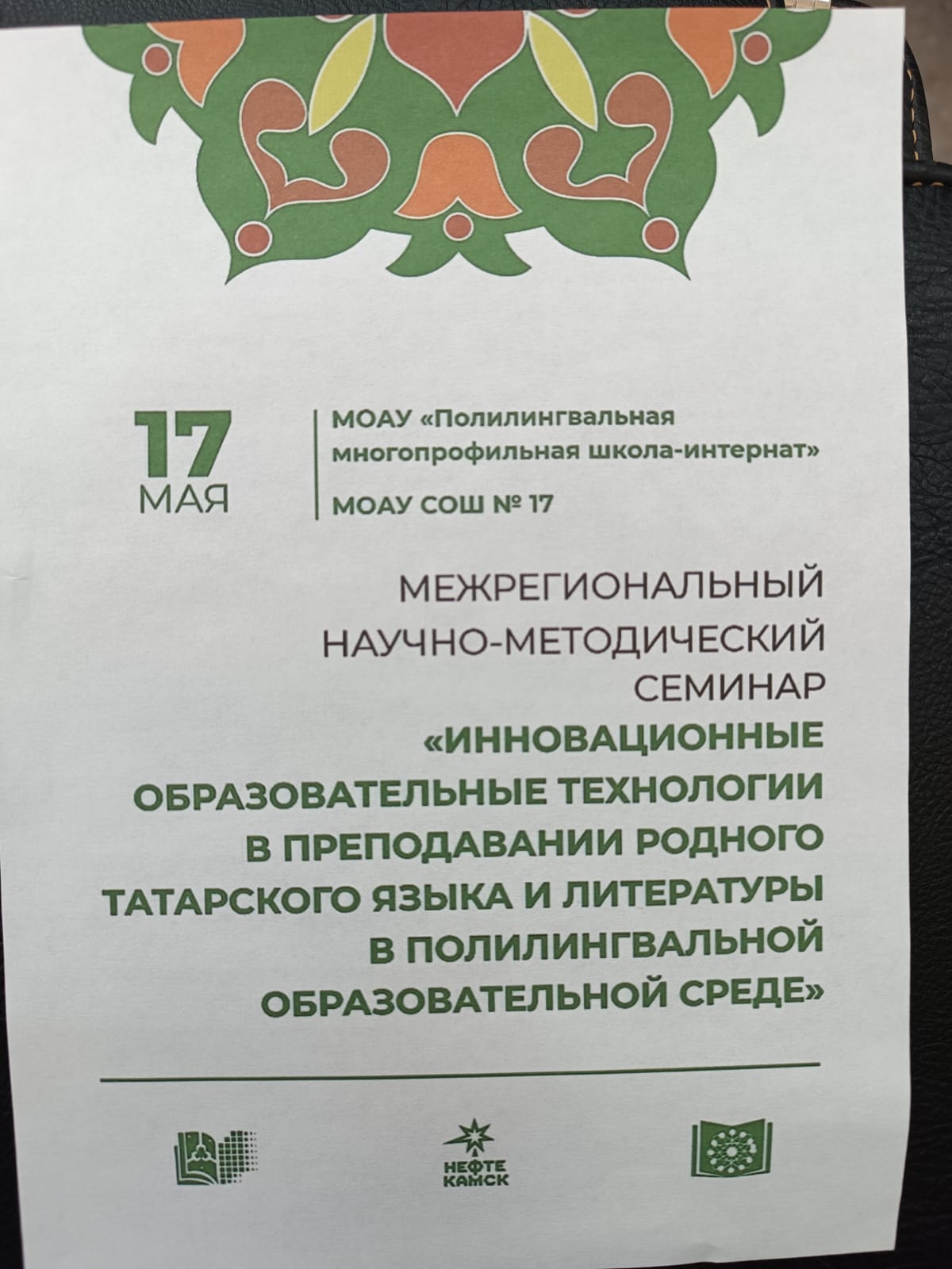 17 мая 2024 года в г. Нефтекамск состоялся Межрегиональный научно-методический семинар «Инновационные образовательные технологии в преподавании родного татарского языка и литературы в полилингвальной образовательной среде». Семинар был организован Министерством образования и науки Республики Башкортостан, Институтом развития образования Республики Башкортостан и Управлением образования Администрации ГО г. Нефтекамск на базе МОАУ «Полилингвальная многопрофильная школа-интернат «Белем» ГО г. Нефтекамск и МОАУ СОШ № 17 ГО г. Нефтекамск.