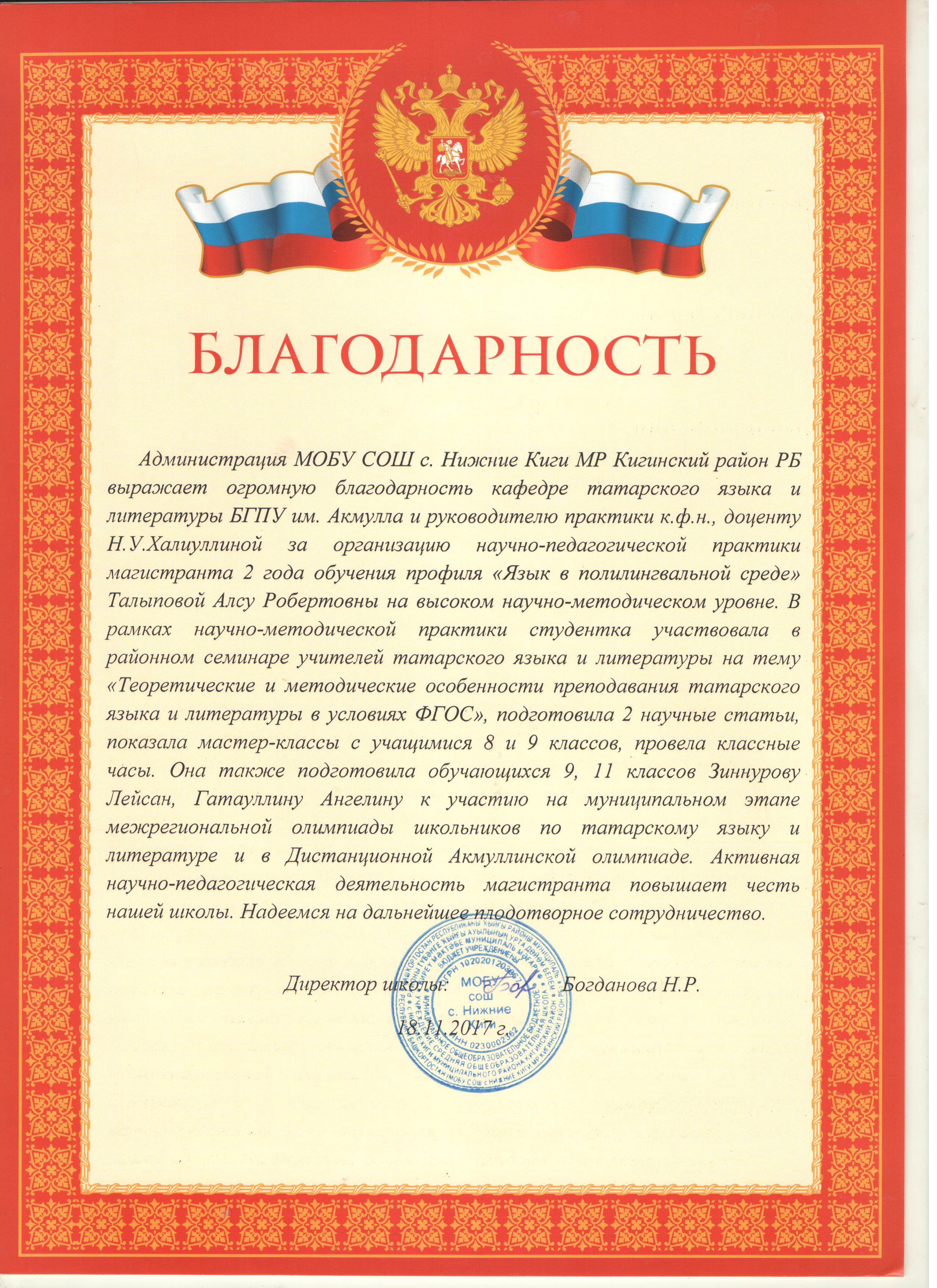 1 декабря 2017 года состоялась отчетная конференция по научно-педагогической практике магистрантов ОДО и ОЗО 2 года обучения  Института филологического образования и межкультурных коммуникаций по направлению подготовки 44.04.01 Педагогическое образование (уровень магистратуры), направленность (профиль) «Язык в полилингвальной среде» ОДО и ОЗО. Базой для прохождения практики стала кафедра татарского языка и литературы ФГБОУ ВО БГПУ им. М.Акмуллы» и ФГБОУ ВО кафедра татарского языка и литературы БГПУ им. М.Акмуллы, МОБУ СОШ с. Нижние Киги МР Кигинский район РБ. Практикантами проведена научно-исследовательская работа по теме магистерской диссертации, подготовлены и проведены открытые лекции по дисциплинам “Современный татарский литературный язык”, “История родного языка”, “Филологический анализ художественного текста” со студентами направления “Педагогическое образование” профиль “Родной (татарский) язык и литература; профиль по выбору; разработаны ФОС (тесты, презентации, кейсы), также они участвовали в подготовке и организации мероприятий, организованных кафедрой татарского языка и литературы. Магистранты приобрели большой опыт научно-педагогической деятельности.