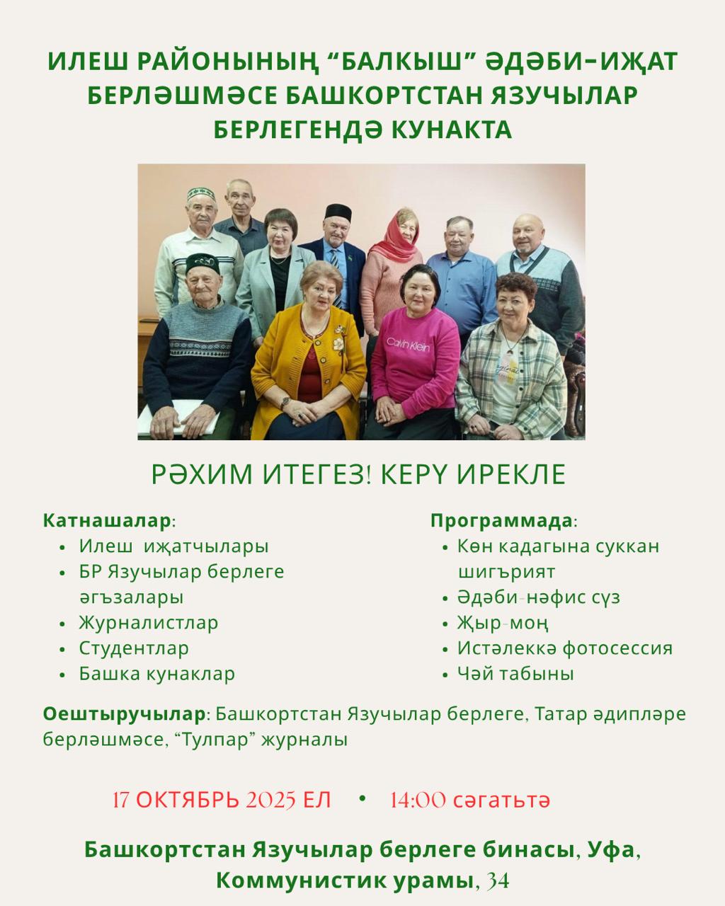 17 октября 2025 года преподаватели кафедры татарского языка и литературы – зав.кафедрой доцент Н.У. Халиулллина, профессор И.С. Насипов, преподаватель Г.Р. Габдулхакова и студенты направления Педагогическое образование направленность (профиль) «Родной (татарский) язык, литература и английский язык« побывали в гостях в Правлении союза писателей РБ, где литературно-поэтический вечер.