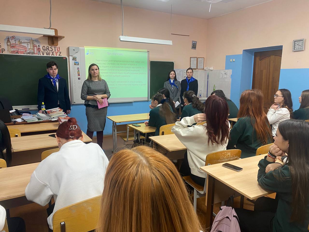 В период с 20 ноября по 17 декабря Гиляжева Алсу, Гареева Алсу, Нафиков Камиль и Хафизова Ленара – студенты 5 курса направления Педагогическое образование (с двумя профилями подготовки) направленность (профиль) «Родной (татарский) язык, литература и английский язык» проходили педагогическую практику по татарскому языку, литературе и английскому языку в МАОУ «Татарская гимназия № 65 им. Гази Загитова» ГО г.Уфа. 11 декабря 2025 года студенты организовали профориентационное мероприятие для обучающихся 11 класса. В мероприятии приняла участие преподаватель кафедры татарского языка и литературы Гульназ Габдулхакова.
