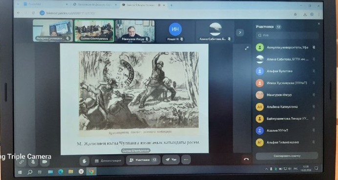 В круглом столе в онлайн формате участвовали преподаватели кафедры татарского языка и литературы Акмуллинского университета, студенты направления “Педагогическое образование” направленность (профиль) “Родной (татарский) язык, литратура и английский язык” института филологического образования и межкультурных коммуникаций. Открыл круглый стол директор ИЯЛИ им.Г.Ибрагимова АН РТ Илгиз Халиков, приветственным словом выступил народный писатель Татарстана, главный редактор издательства «Язучы» при Союзе писателей РТ Газинур Мурат. Докладами выступили доктор филологических наук, главный научный сотрудник отдела литературоведения ИЯЛИ им.Г.Ибрагимова Дания Загидуллина, доктор филологических наук, зав. отделом литературоведения ИЯЛИ им.Г.Ибрагимова Альфат Закирьянов, доктор филологических наук, профессор кафедры литературоведения КФУ Нурфия Юсупова, кандидат филологических наук, главный научный сотрудник отдела литературоведения ИЯЛИ им.Г.Ибрагимова Лейсан Галиева, кандидат искусствоведения, ведущий научный сотрудник Центра искусствоведения Института языка, литературы и искусства им. Г. Ибрагимова Ольга Улемнова. Были затронуты разные аспекты изучения литературного наследия Мусы Джалиля, его место в национальной картине мира, раскрыты интересные факты из жизни поэта, идеи гуманизма в творчестве, отражение образа поэта в искусстве.