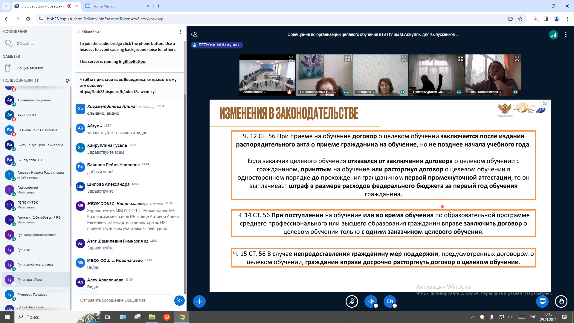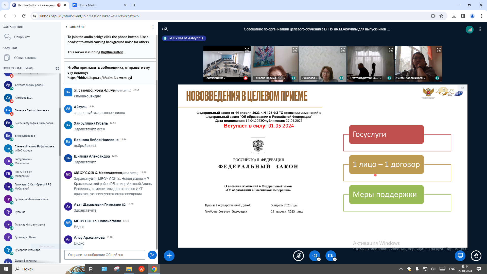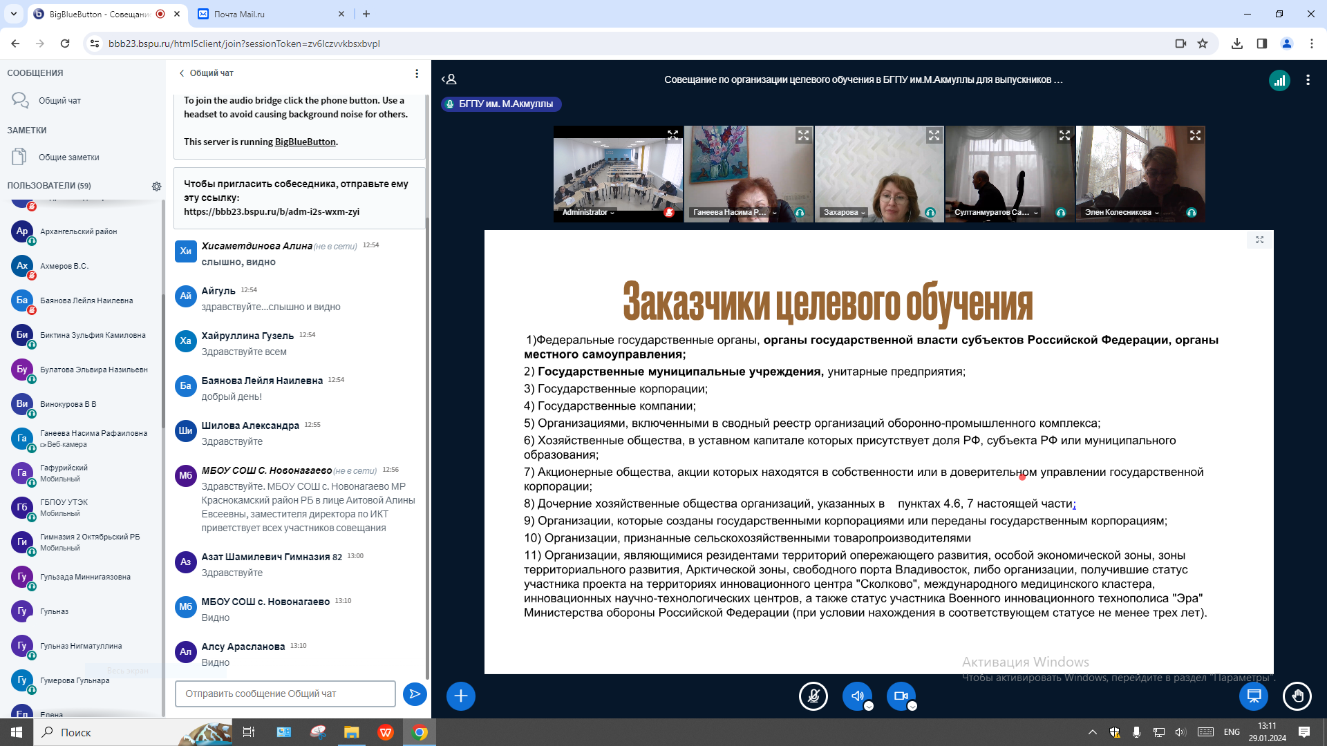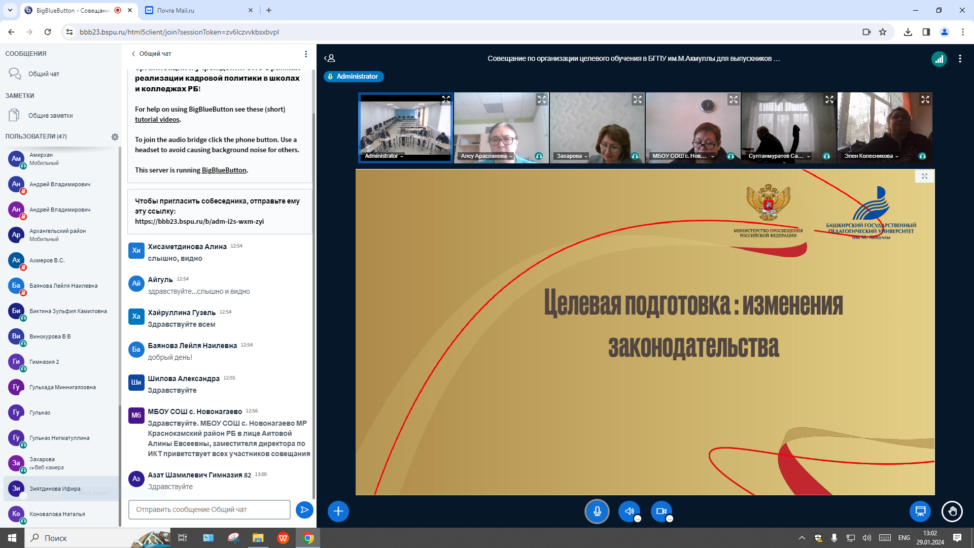 29 января 2024 года в Институте исторического, правового и социально-гуманитарного образования  совместно с управлением рекрутинга и карьерного развития состоялось  совещание, посвященное вопросам организации целевого обучения в БГПУ им. М.Акмуллы для выпускников общеобразовательных организаций и учреждений СПО в рамках реализации кадровой политики в школах и колледжах Республики Башкортостан, подготовки учителей и преподавателей социально-гуманитарных дисциплин.