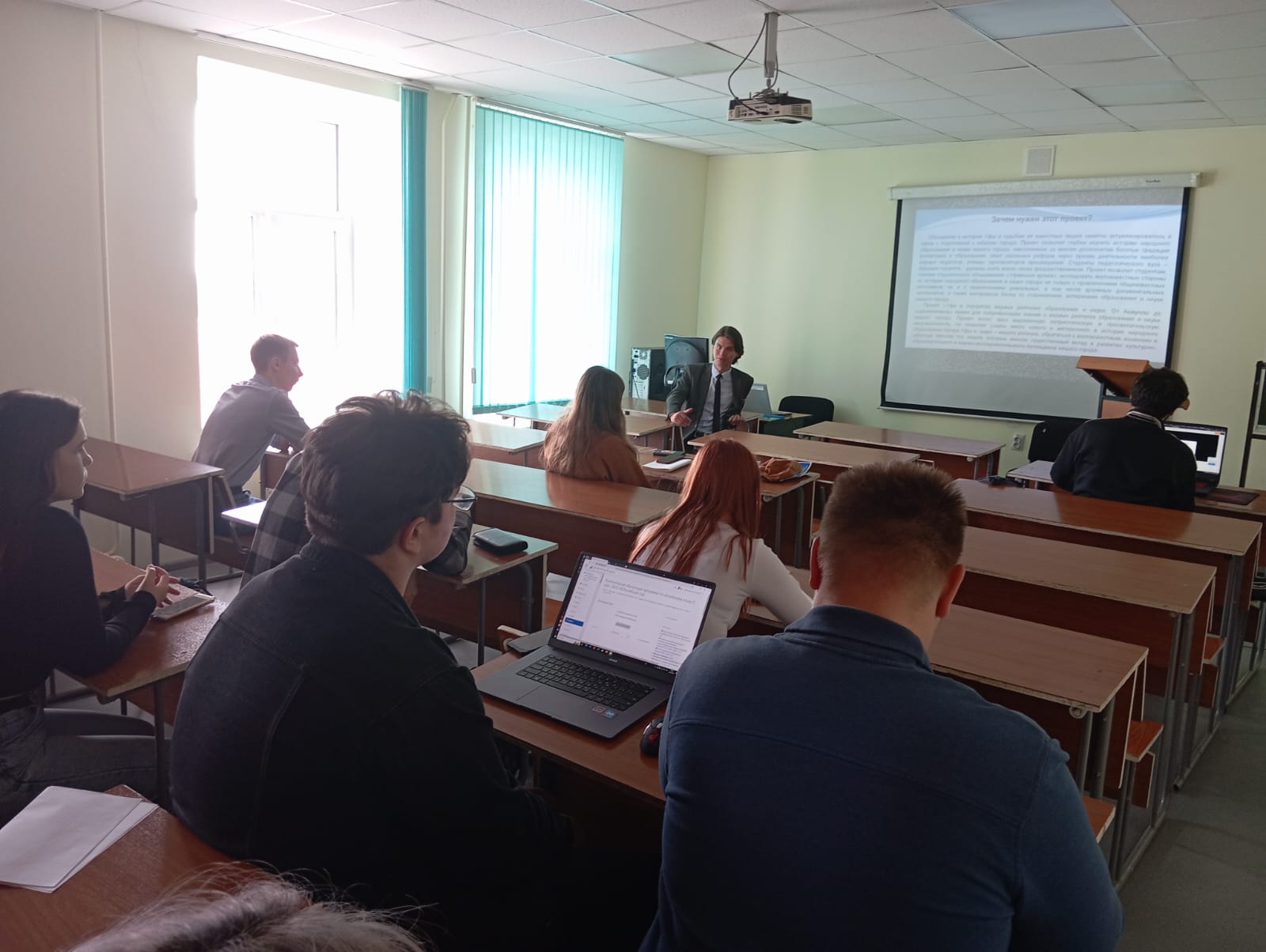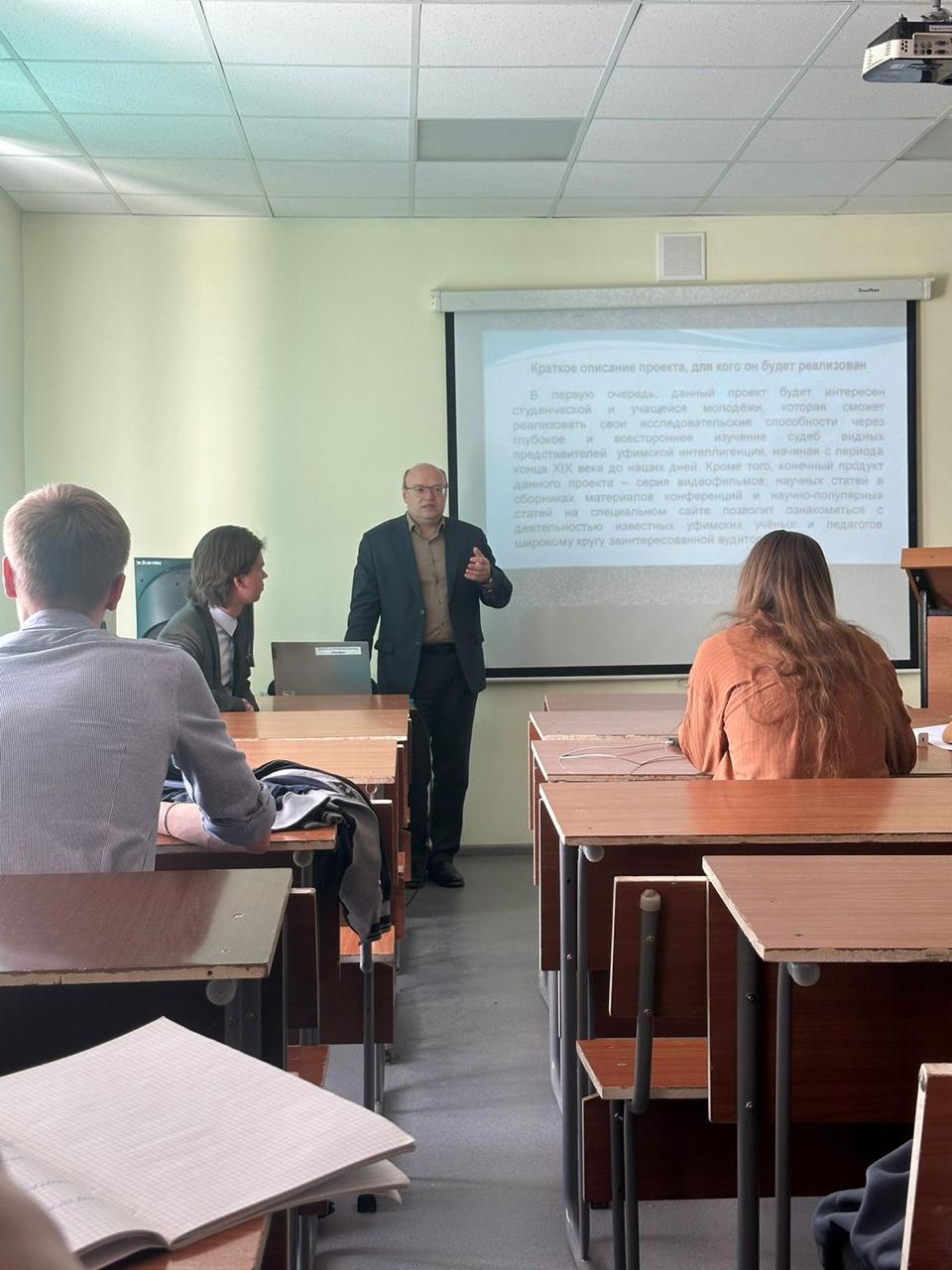 24 мая 2024 г. студенты Института исторического, правового и социально-гуманитарного образования, члены клуба «Уфимское время» провели презентацию своей заявки на Всероссийский студенческий проект «Твой ход». Заявка носит название «Уфа в портретах видных деятелей образования и науки. От Акмуллы до современников». Слушателями стали студенты-историки первого курса.