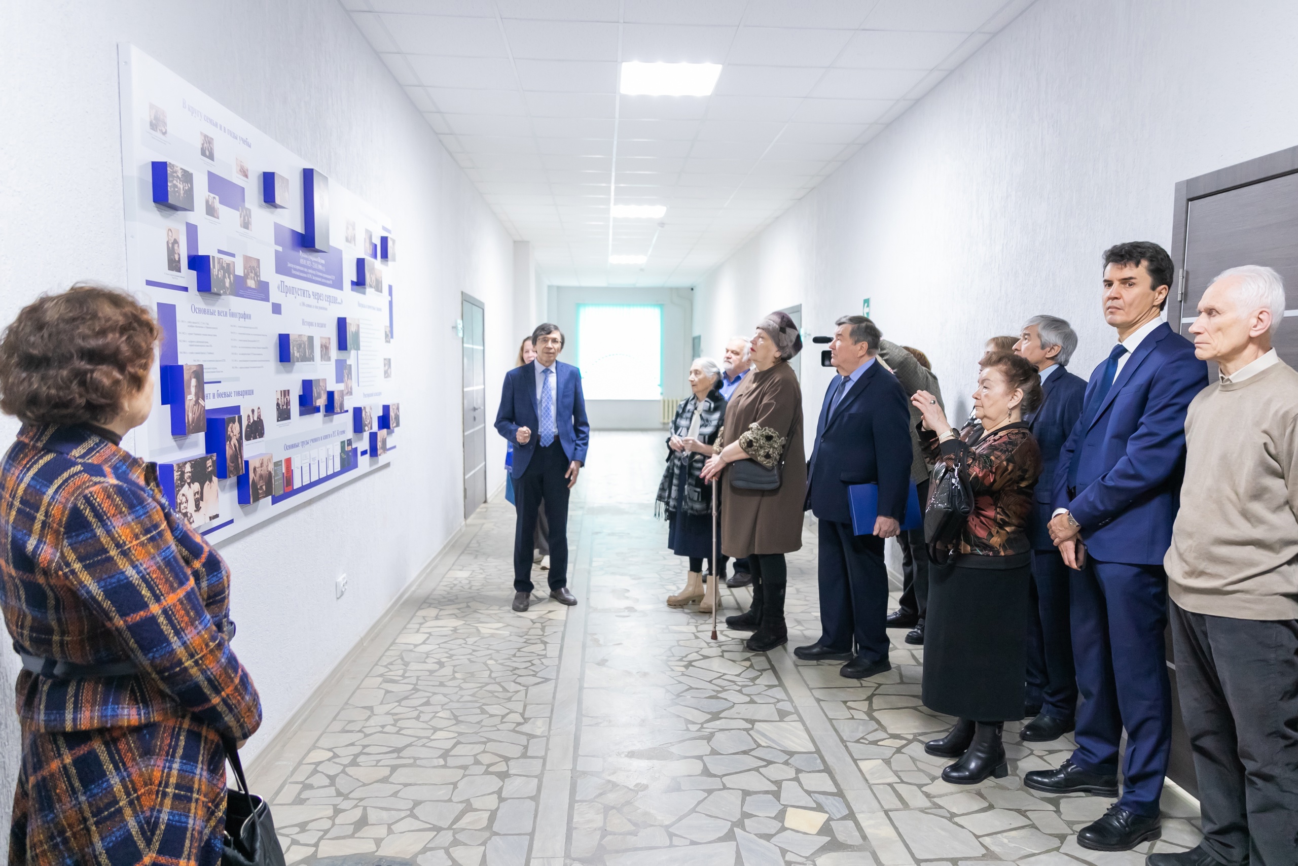 После торжественной церемонии для ветеранов была проведена экскурсия по корпусу. Около мемориального стенда  «Пропустить через сердце…», открытого в 2023 году к 100-летию Р.Г. Кузеева, заведующий кафедрой отечественной и всеобщей истории БГПУ им. М.Акмуллы Рустам Алмаев напомнил о вехах жизненного пути ученого и руководителя.