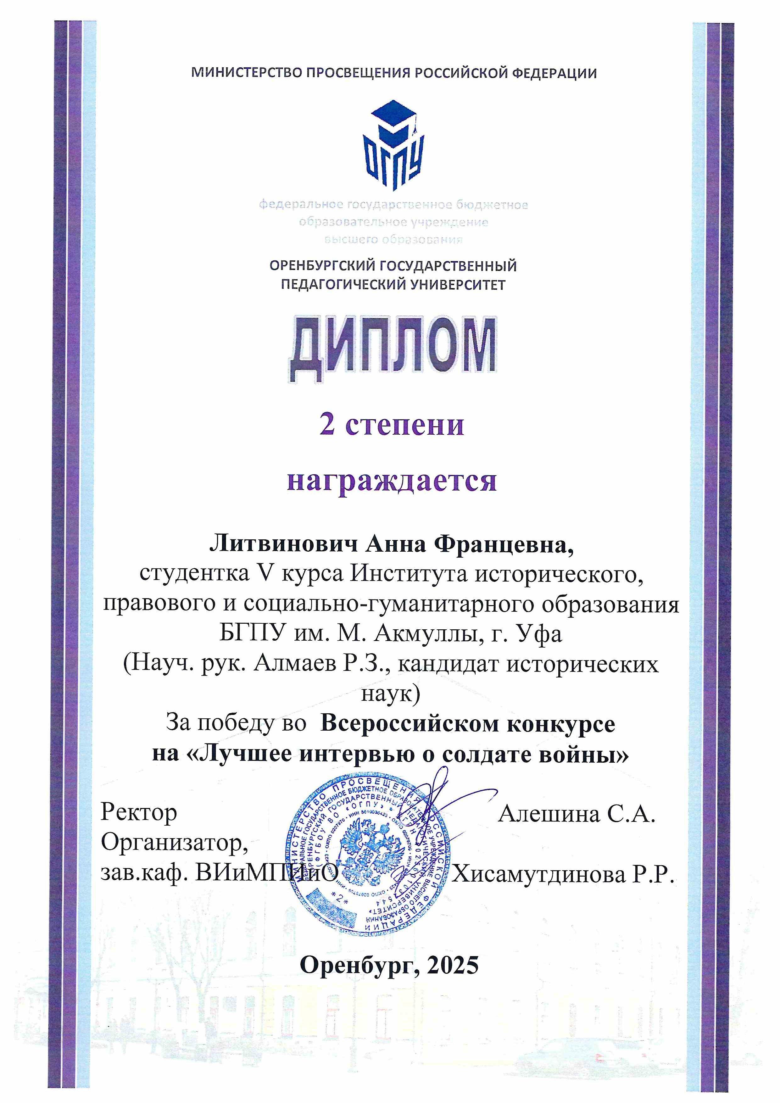 В Оренбургском государственном педагогическом университете прошел Всероссийский конкурс «Лучшее интервью о солдате войны», посвященный 80-летию Победы в Великой Отечественной войне. Студенты Института исторического правового и социально-гуманитарного образования приняли активное участие в конкурсе.