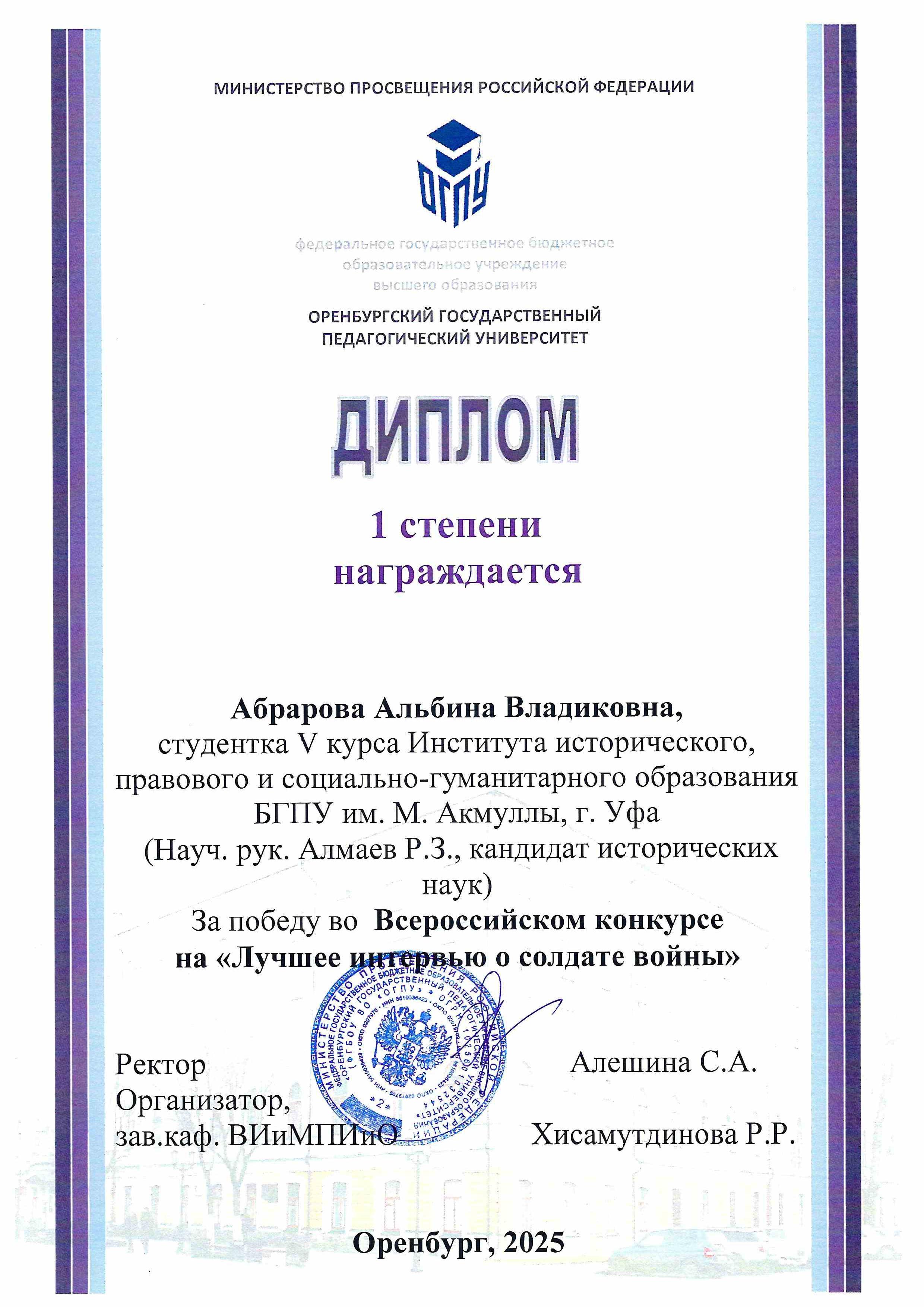 В номинации «Интервью с ребенком войны» диплома 1 степени удостоена студентка 5 курса профиля «История и обществознание» Альбина Абрарова. Студентка 5 курса профиля «История и обществознание» Анна Литвинович в той же номинации награждена дипломом 2 степени. Научный руководитель обеих работ – кандидат исторических наук, доцент Рустам Закирович Алмаев.