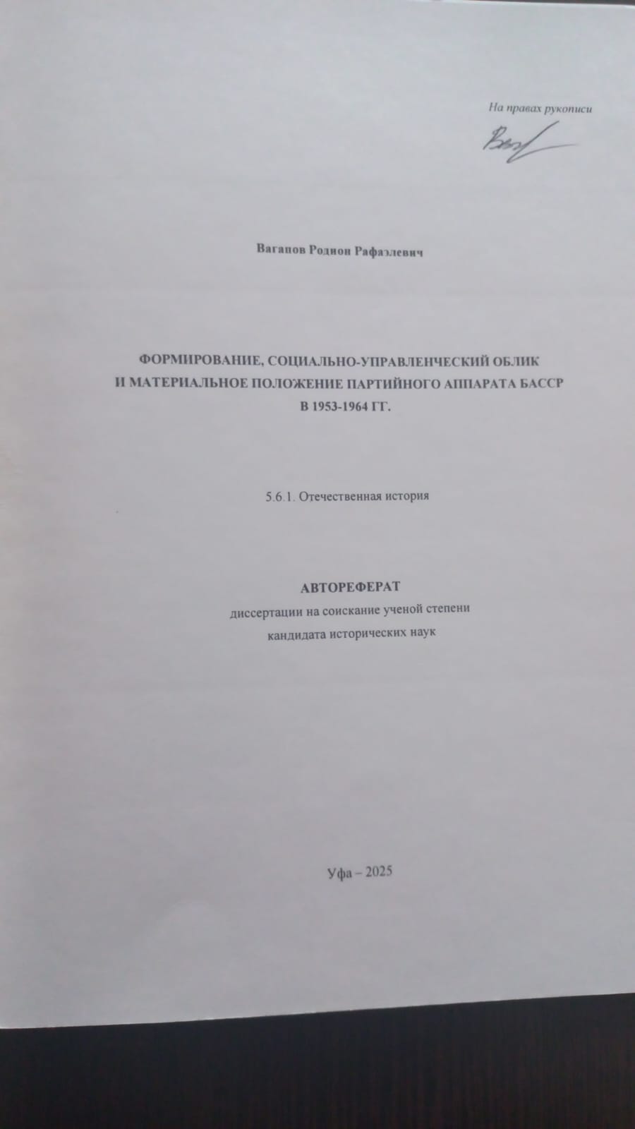 30 мая 2025 г. в Уфимском университете науки и технологий прошли первые защиты кандидатских диссертаций по специальности 5.6.1. «Отечественная история» в новом обновленном диссертационном совете. Кафедра отечественной и всеобщей истории (заведующий кафедрой канд. ист. наук, доцент Р.З. Алмаев) выступила в качестве ведущей организации по диссертации соискателя УУНиТ Родиона Вагапова «Формирование, социально-управленческих облик и материальное положение партийного аппарата БАССР в 1953-1964 гг.».  Ведущая организация при защите диссертации – это учреждение, которое может дать объективную оценку значимости проведённого аспирантом исследования. Оно должно вести научную деятельность в исследуемой области науки.