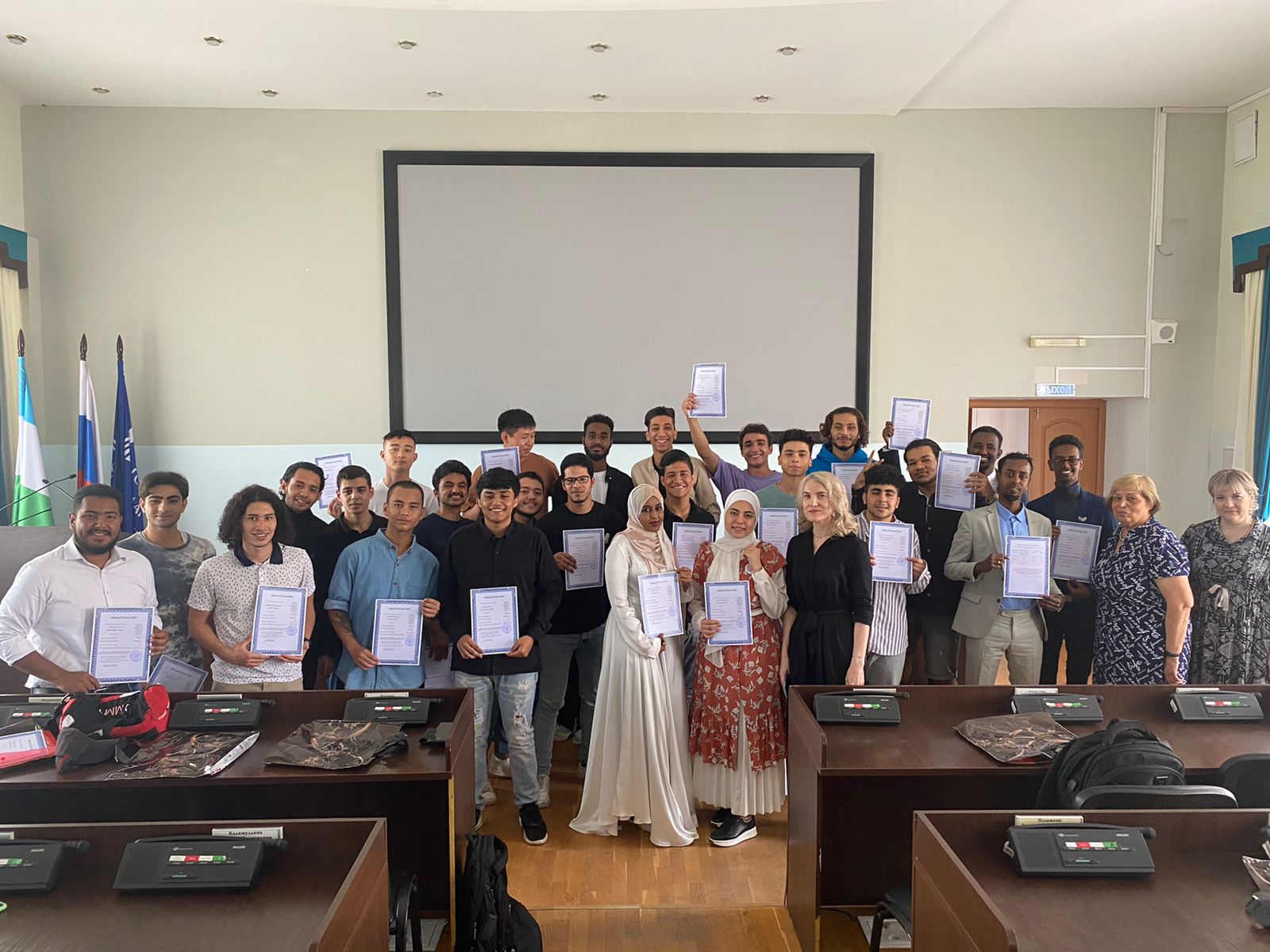 20 июля слушателям из Египта, Ирана, Китая, Колумбии и Сомали, успешно завершившим дополнительную общеобразовательную программу, были выданы свидетельства о завершении обучения. Поздравили иностранцев с окончанием обучения и пожелали им дальнейших успехов начальник управления международных связей Радик Юлбаев, руководитель дополнительной общеобразовательной программы «Подготовка иностранных граждан и лиц без гражданства к освоению профессиональных образовательных программ на русском языке» Гульнара Кудинова, руководитель подготовительного отделения для иностранных граждан Татьяна Капишева, преподаватели Гузель Курбангалеева и Екатерина Попова.