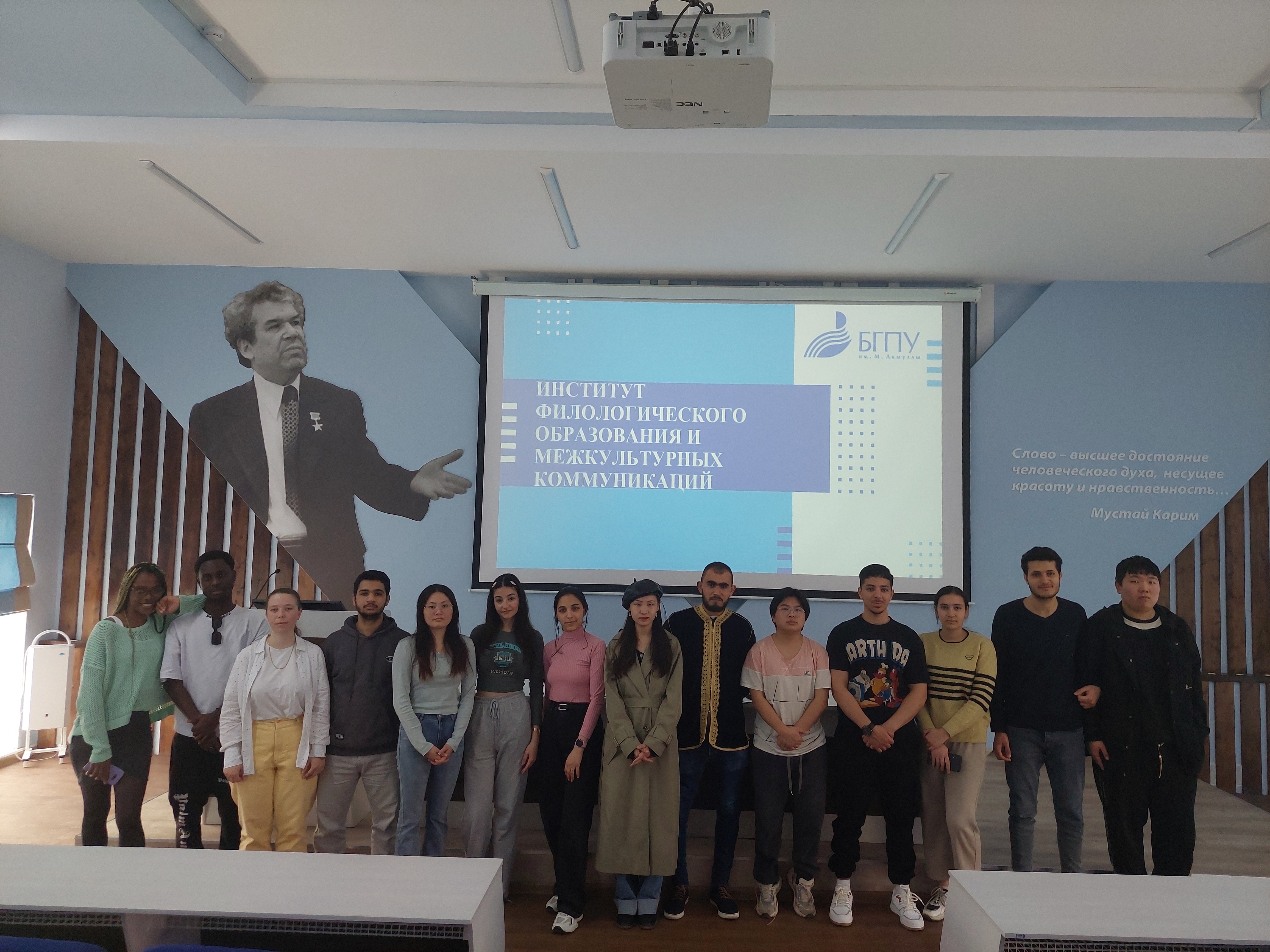 18 апреля состоялась презентация языковых факультетов университета. Иностранные граждане получили информацию о программах, реализуемых в Институте филологического образования и межкультурных коммуникаций и на факультете башкирской филологии. С приветственным словом от Института филологического образования и межкультурных коммуникаций выступила заместитель директора по учебной работе Новоселова Юлия Александровна. Зав. кафедрами межкультурной коммуникации и перевода Юсупова Юлия Рустэмовна и романо-германской филологии и методики обучения иностранным языкам Буркова Татьяна Александровна познакомили слушателей с программами, включающими профиль «Иностранный язык», студентка 4 курса Мичурина Мария рассказала об особенностях обучения на профиле «Иностранный (английский) язык и русский язык как иностранный», преподаватель кафедры русского языка, теоретической и прикладной лингвистики Капишева Татьяна Юрьевна – о профиле «Русский язык и литература».